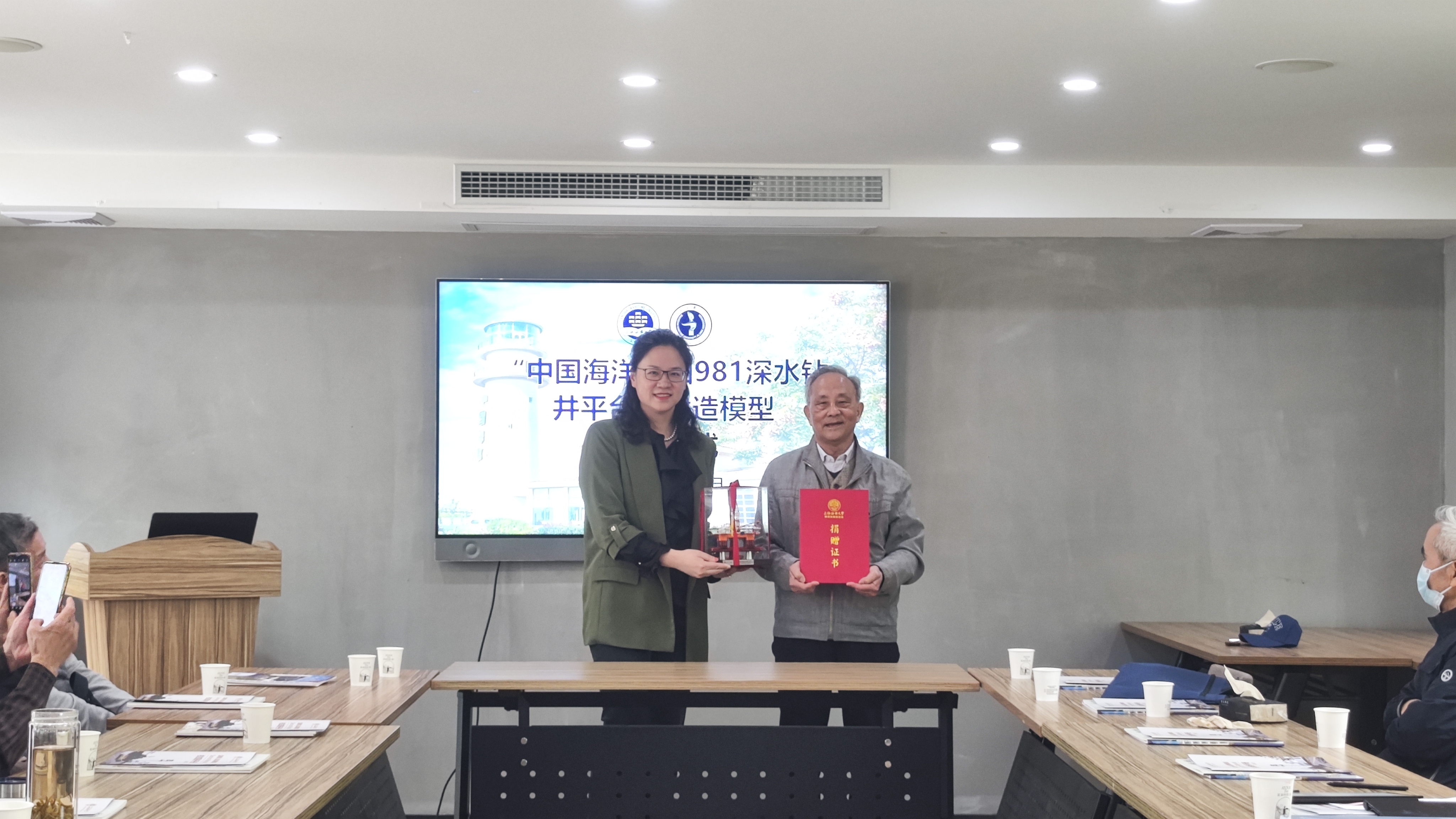 林鸿栋校友向母校赠送了“中国海洋石油981深水钻井平台”建造模型,校友联络处代表学校向所有与会校友赠送了校徽和校名棒球帽。