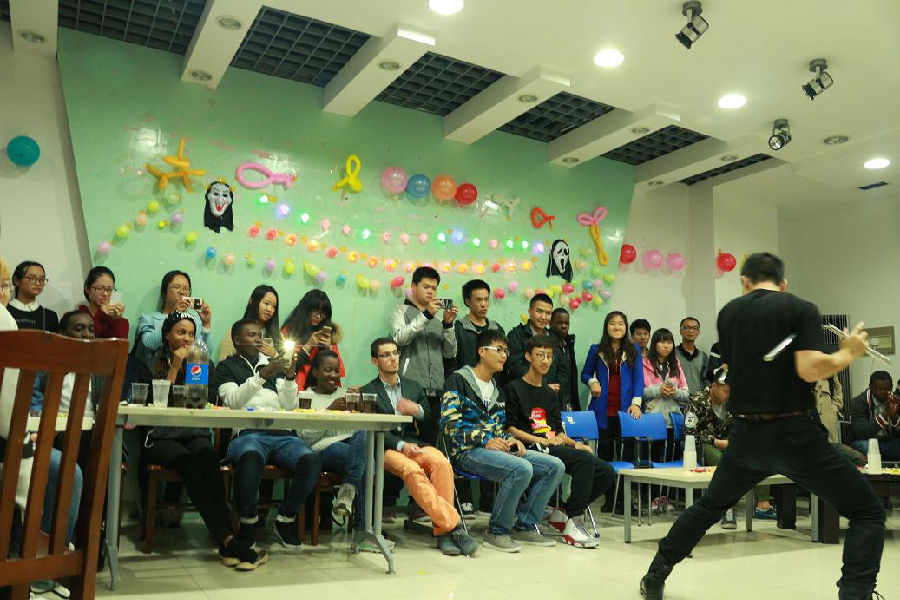 在当天晚会现场,激情的B-Box表演作为开场节目,引爆了全场气氛。随后,击鼓传花、中国风舞蹈、竹笛演奏、双节棍表演、魔术、吉他弹唱、英文歌对唱、斗舞、即兴小喜剧等精彩纷呈的节目轮番上演,中外学生还进行了面对面的互动交流,现场气氛活跃。