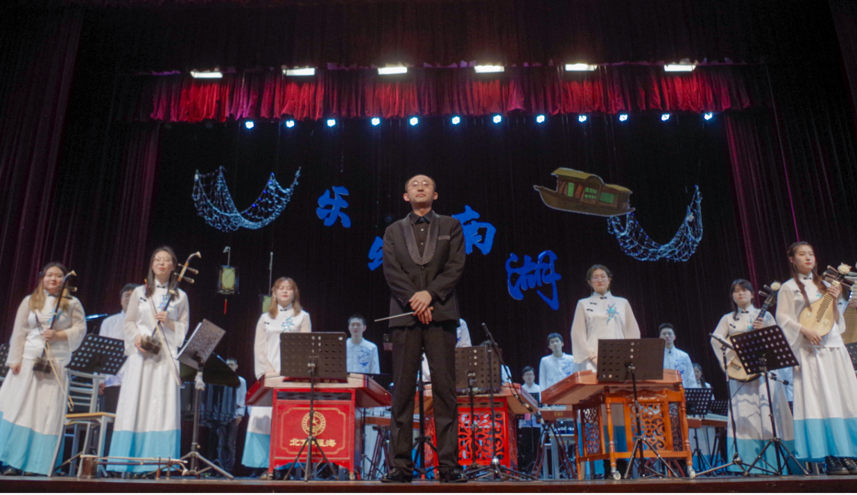 音乐会分为“国乐奏千年”和“红歌永流传”两个板块,以民乐特有的表演形式展现经典红色音乐作品。开场大合奏《夜色》和《芒种》营造出现场热烈的气氛,随后乐团以各声部重奏及民乐小型合奏的形式向现场师生展示民乐独特的魅力,普及民族乐器,传承民族文化。音乐会还结合视频讲述在“红船”播撒中国革命火种、开启中国共产党跨世纪航程的故事;演出最后在大合奏《瑶族舞曲》《北京喜讯到边寨》中落幕。