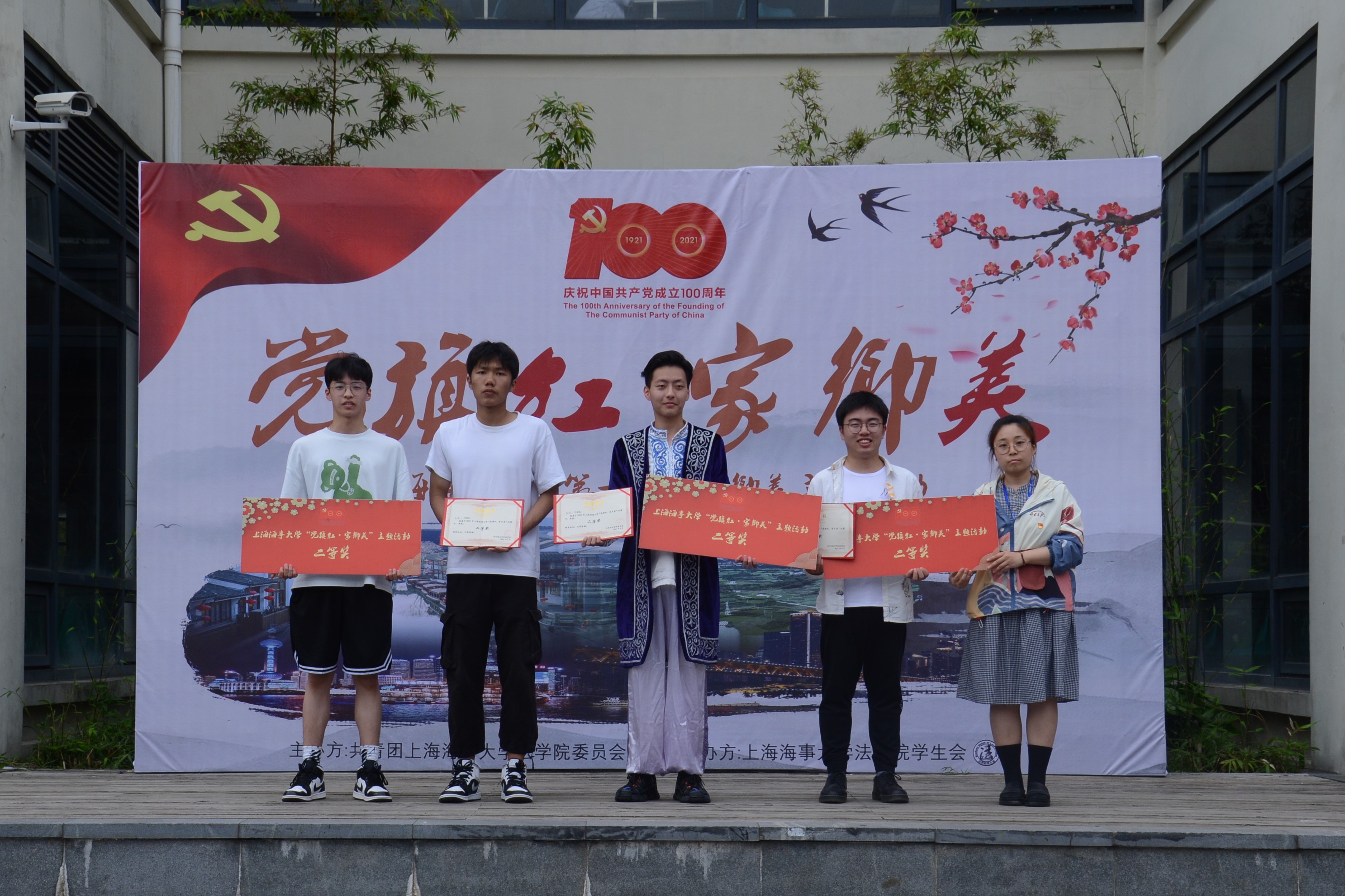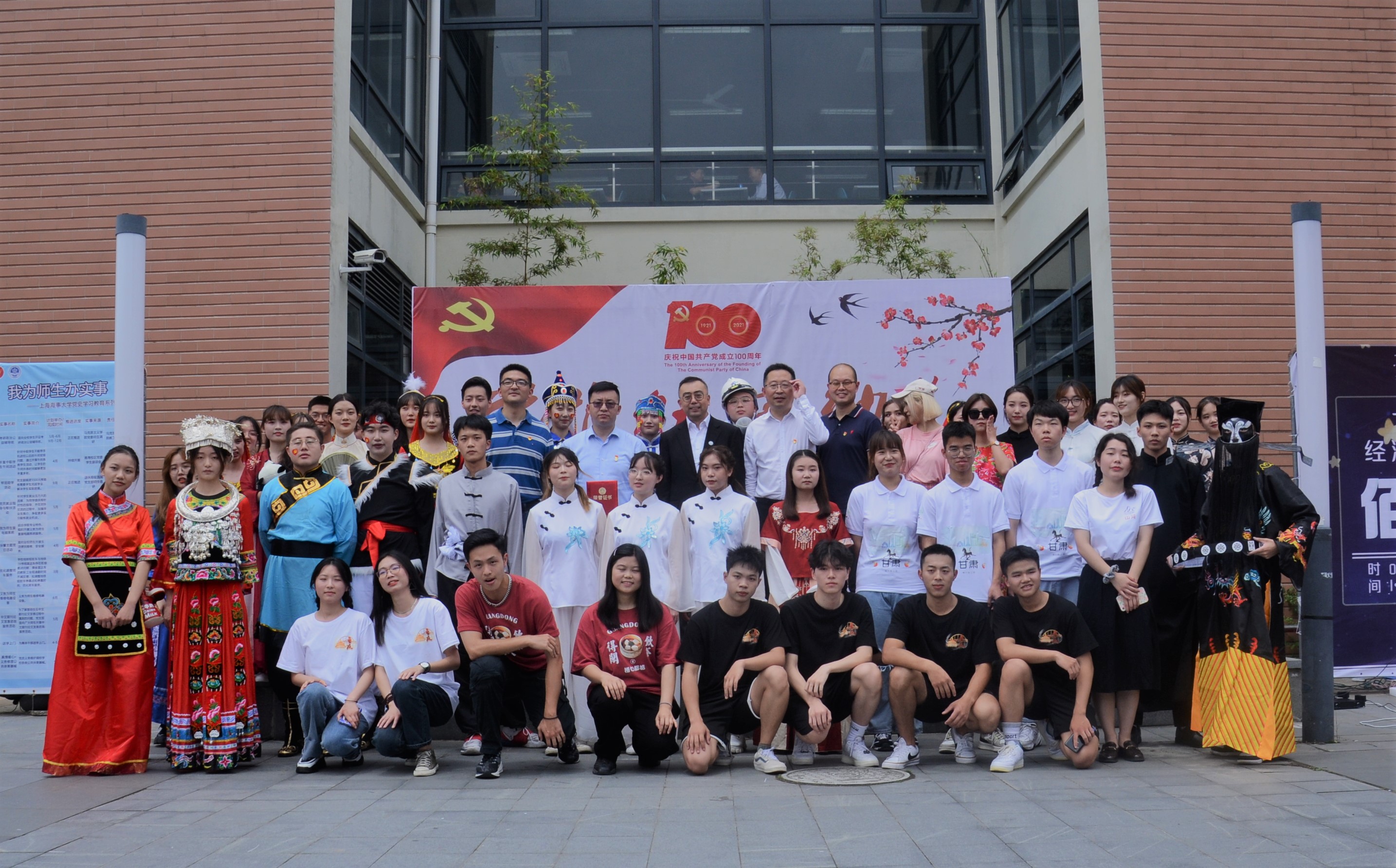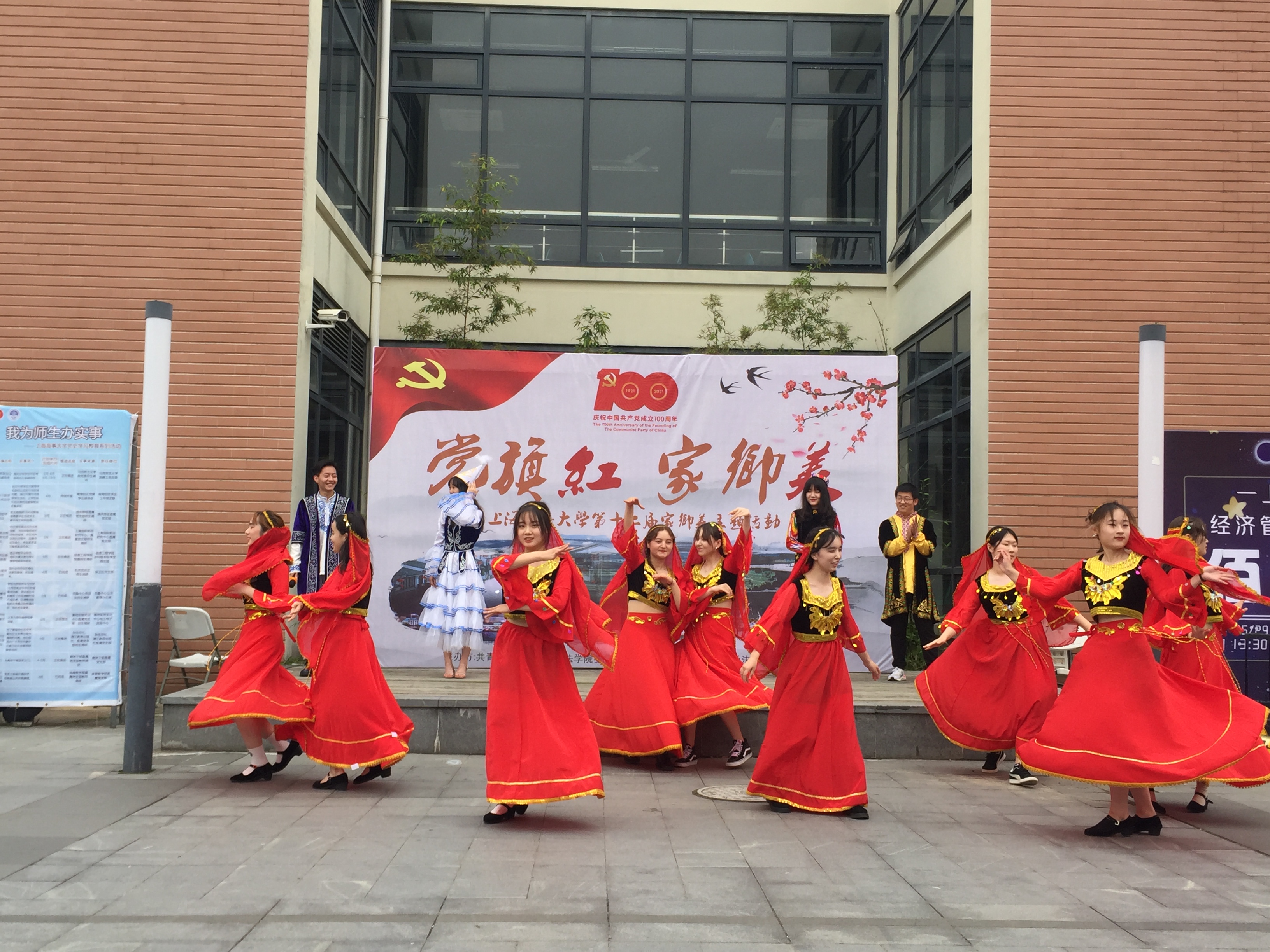 2021年5月28日,为庆祝中国共产党成立100周年,上海海事大学法学院于北广场举办“党旗红,家乡美”主题活动。数百余名师生驻足欣赏,在地方美食文化和丰富的表演中感悟中国共产党团结带领人民创造的辉煌成就。