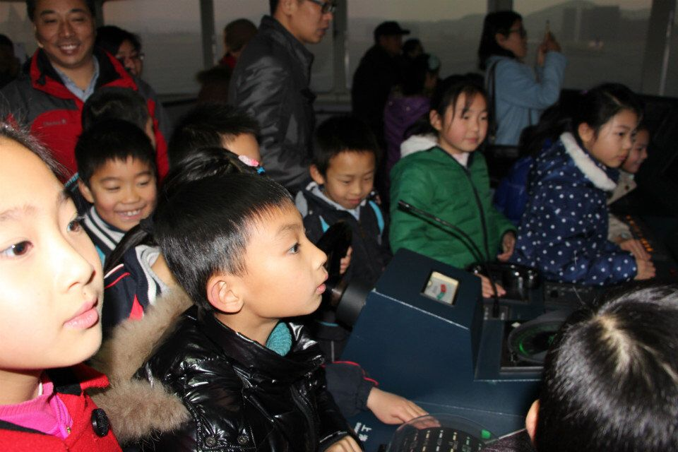 商船学院夏海波老师《跟着船长去探险》的精彩讲座也吸引了不少孩子,制作精美的PPT课件向孩子们揭开了地球形态及构成、地球怎样变成一张平面的地图、航海历史、伟大的航海家等精彩科普知识。在航海横拟实验室,孩子们还体验了“小小船长”的职责,有模有样地开着 “大船”到世界各地的港口“航行”了一圈。