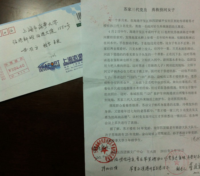 近日,我校黄有方校长收到群众来信表扬海洋环境与工程学院09级港航专业苏洁同学一家三代党员勇救投河女子的事迹。