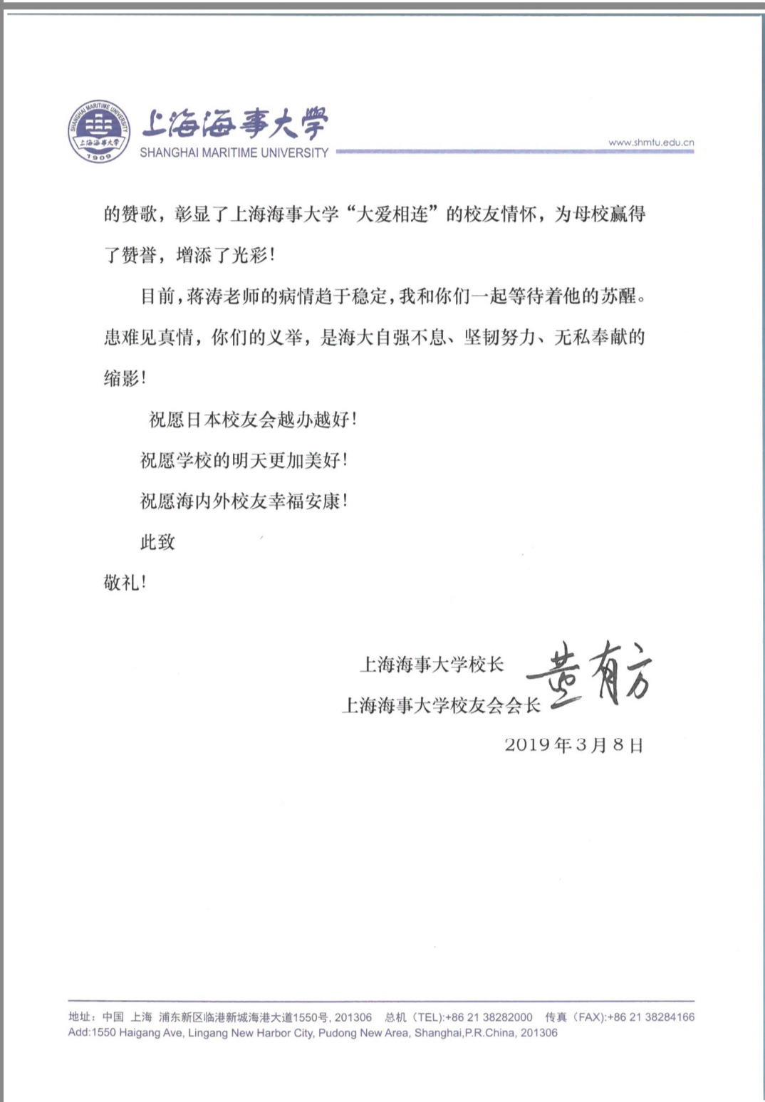 为了表达感谢,黄有方校长专门致信日本校友会,感谢他们关心学校,关爱教师,在蒋涛老师危难之时雪中送炭,帮助他和家属渡过难关,这份大爱相连的情怀使学校师生深受感动,并祝愿日本校友会的校友们幸福安康。