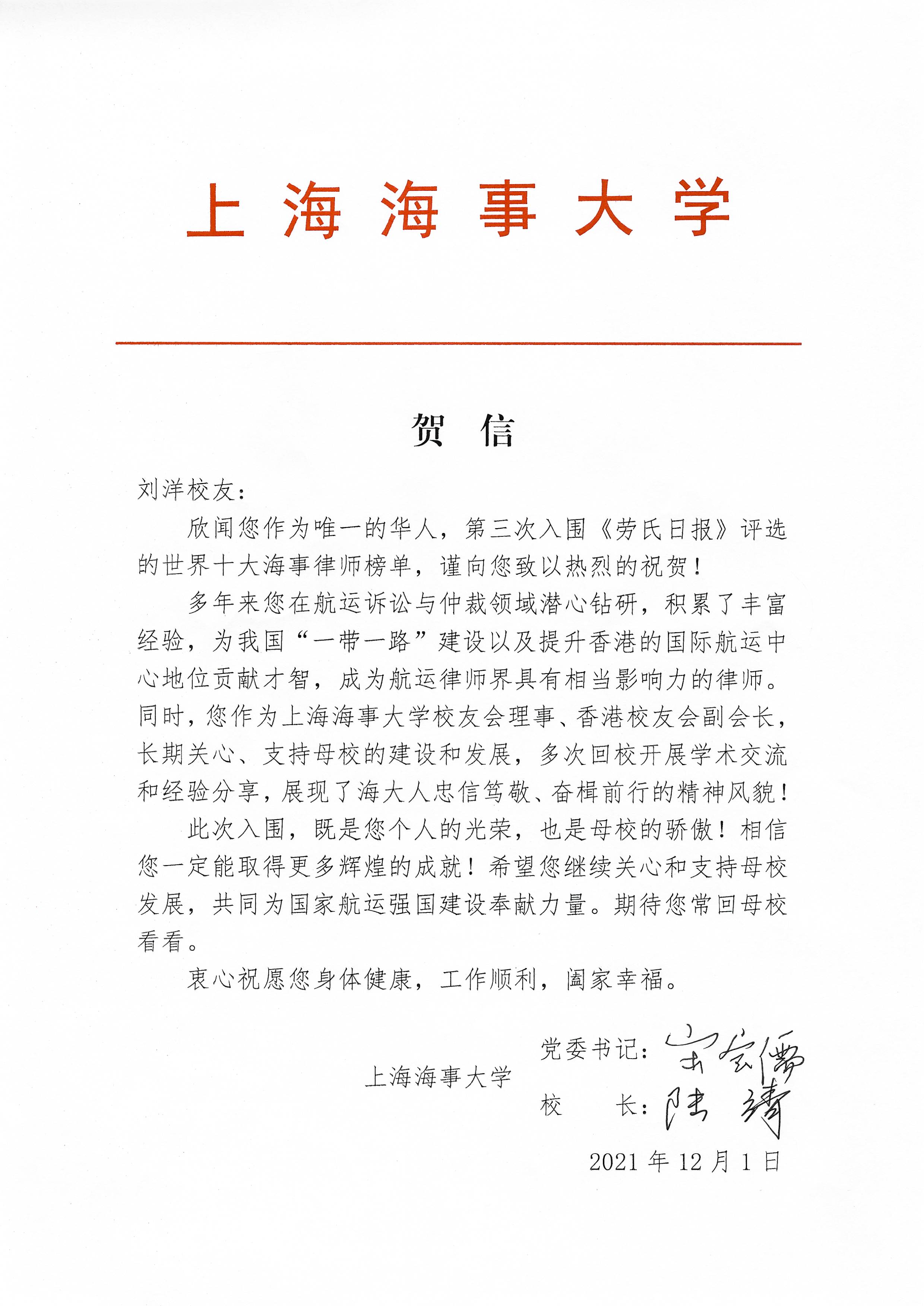 得知刘洋校友入围的喜讯后,校党委书记宋宝儒、校长陆靖第一时间发去贺信,代表学校向他表示祝贺,并感谢他作为上海海事大学校友会理事、香港校友会副会长,长期关心、支持母校的建设和发展,希望他继续支持母校发展,共同为国家航运强国建设贡献力量。