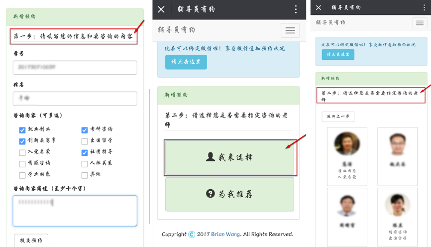 双向互通,信息共享。以往的辅导员接受学生的咨询,师生之间的信息都是相对封闭。辅导员的工作情况学生也不一定完全清楚,这给需要咨询的学生带来了很多不便。而通过网络预约,便可以使得学生对辅导员或者老师“是否已经被预约”、“什么时候有空”等信息全面掌握,大大提升双方效率。