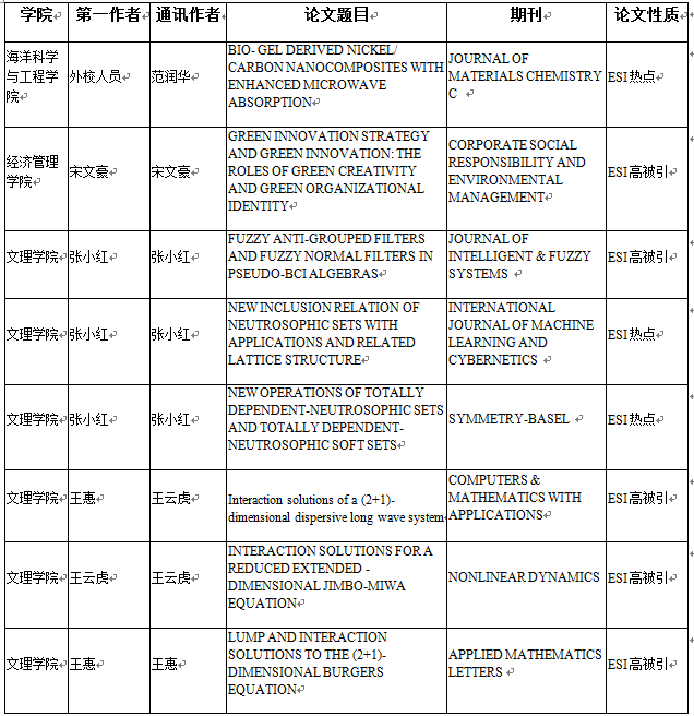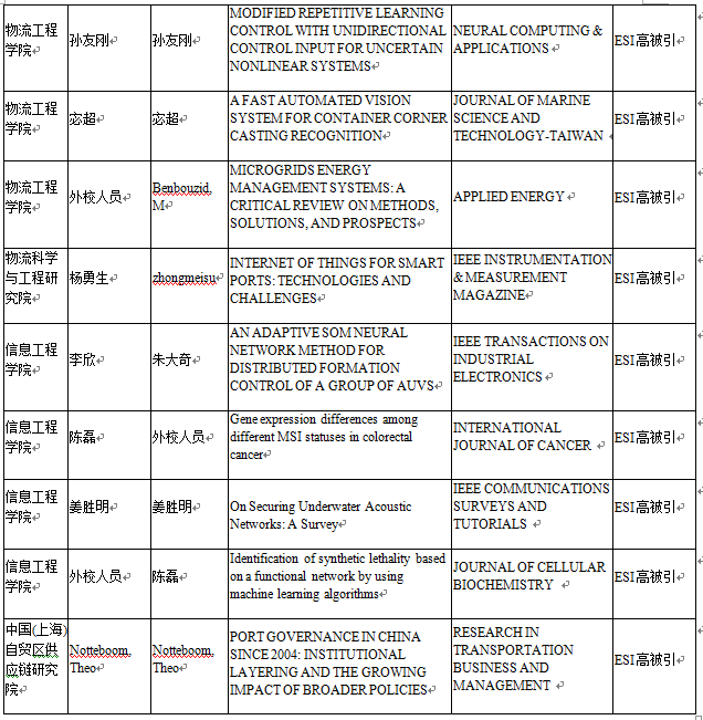 2019年1月至8月底,上海海事大学老师发表的高水平论文取得新突破,以我校为第一作者或通讯作者发表的SCI论文已达269篇,SCI论文发表量已超过2018年全年的265篇,反映了近年来我校基础研究水平稳步提高,今年又取得新突破。根据ESI数据库最新数据显示,截至2019年8月底,以我校为第一作者或通讯作者发表的ESI高被引论文、热点论文共74篇,2019年新增17篇,其中ESI高被引论文14篇、ESI热点论文3篇(详见下表)。