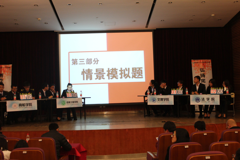 经过初赛、复赛的激烈角逐,四支队伍脱颖而出进入决赛。决赛共分为个人必答题、抢答题和情景模拟题等三个环节,各参赛团队竞相展现丰富的法律知识,评委们给予了精彩的点评,使得现场师生对法律尤其是宪法知识有了更深刻的认识和理解。最终,商船学院代表队赢得了本次比赛的冠军,信息工程学院荣获二等奖,法学院和文理学院获得三等奖。