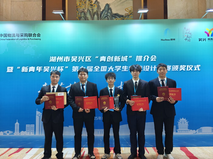 8 月 30 日,由中国物流与采购联合会主办的 “新青年吴兴杯” 第九届全国大学生物流设计大赛决赛在湖州落下帷幕。由董良才和舒帆老师指导的梁博鑫、赵佳晨、刘睿、饶爱涛和李建平团队发挥出色,荣获全国一等奖。