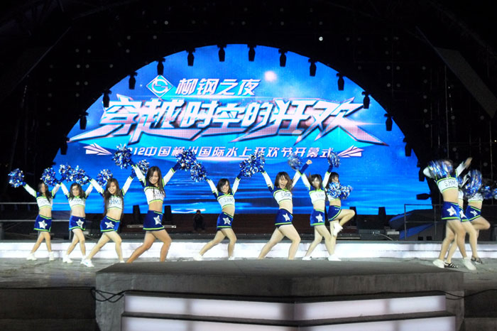 9月29日晚,2012中国柳州国际水上狂欢节在柳江明珠水上大舞台开幕。谢霆锋、严当当、韦唯、汪涵、陈楚生、江映蓉、至上励合等明星在开幕式上演出。上海海事大学健美操队圆满完成开幕式演出任务。