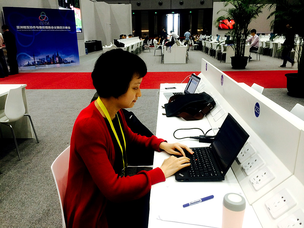 我校两位青年志愿者自4月底就开始参与峰会的培训和模拟演练。会议期间,都志亮老师被分配在新闻宣传组,协助外交部新闻司联络员接洽联合国和卡塔尔、伊拉克的记者,并协助上海市外办新闻处联络其他各部门。李佳韵老师主要参与亚信新闻中心官方网站(media.cica-china.org)和亚信掌上新闻中心(APP)的建设、检查、纠错、翻译以及资料准备(包括会议资料和在上海生活出行需要的信息等),为国内外媒体记者打造一个方便快捷的获取信息相关的平台。