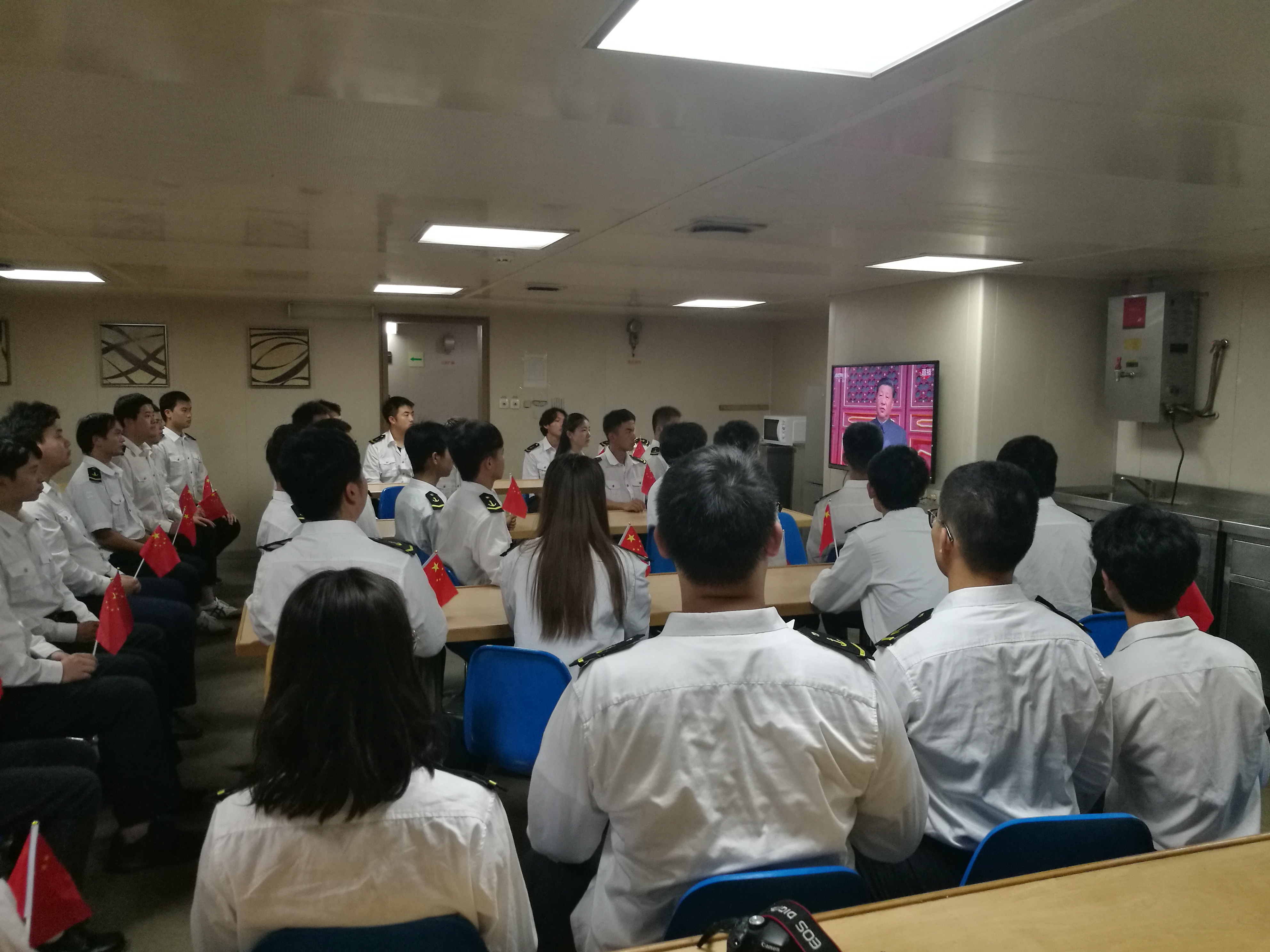 我校119名在“育明“轮上实习的同学,也集中观看了庆典直播和阅兵仪式,并举行了各种形式的为祖国送祝福活动。