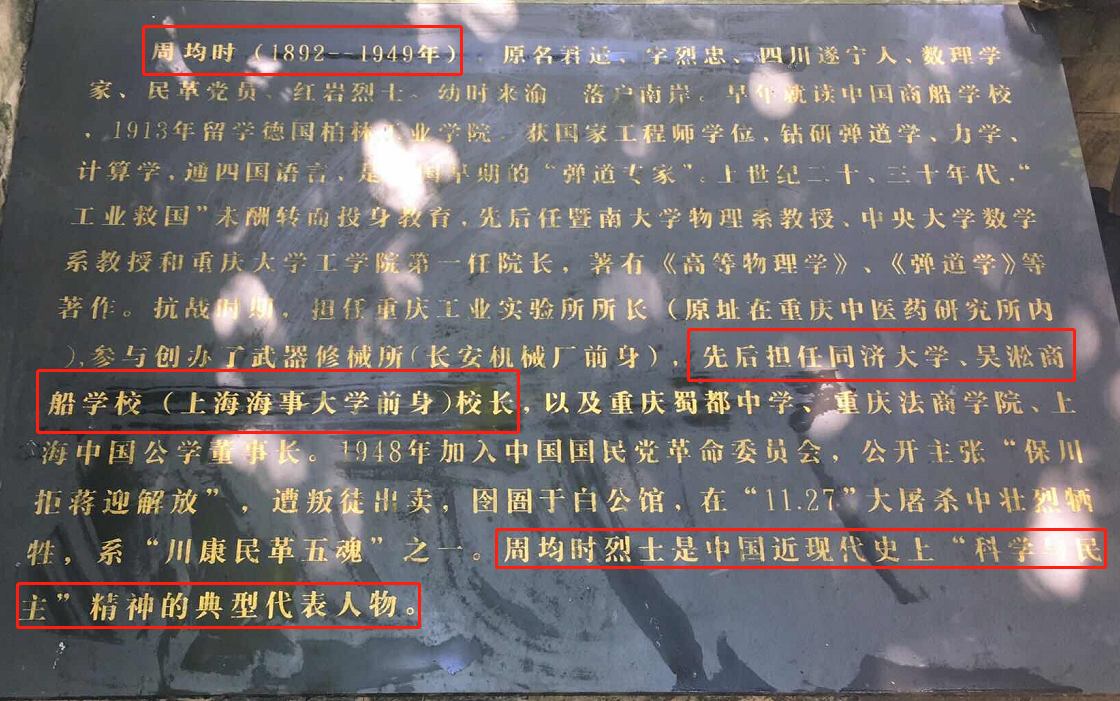 周均时是我国著名数理学教育家,抗战胜利后出任我国立吴淞商船专科学校首任校长,深受吴淞商船老校友爱戴。周均时于1949年8月20日被捕,11月27日在松林坡壮烈牺牲。重庆解放后,遗体经党和人民政府收殓,遵家属意见,葬于重庆市南岸凉风垭(位于重庆邮电大学后山)。