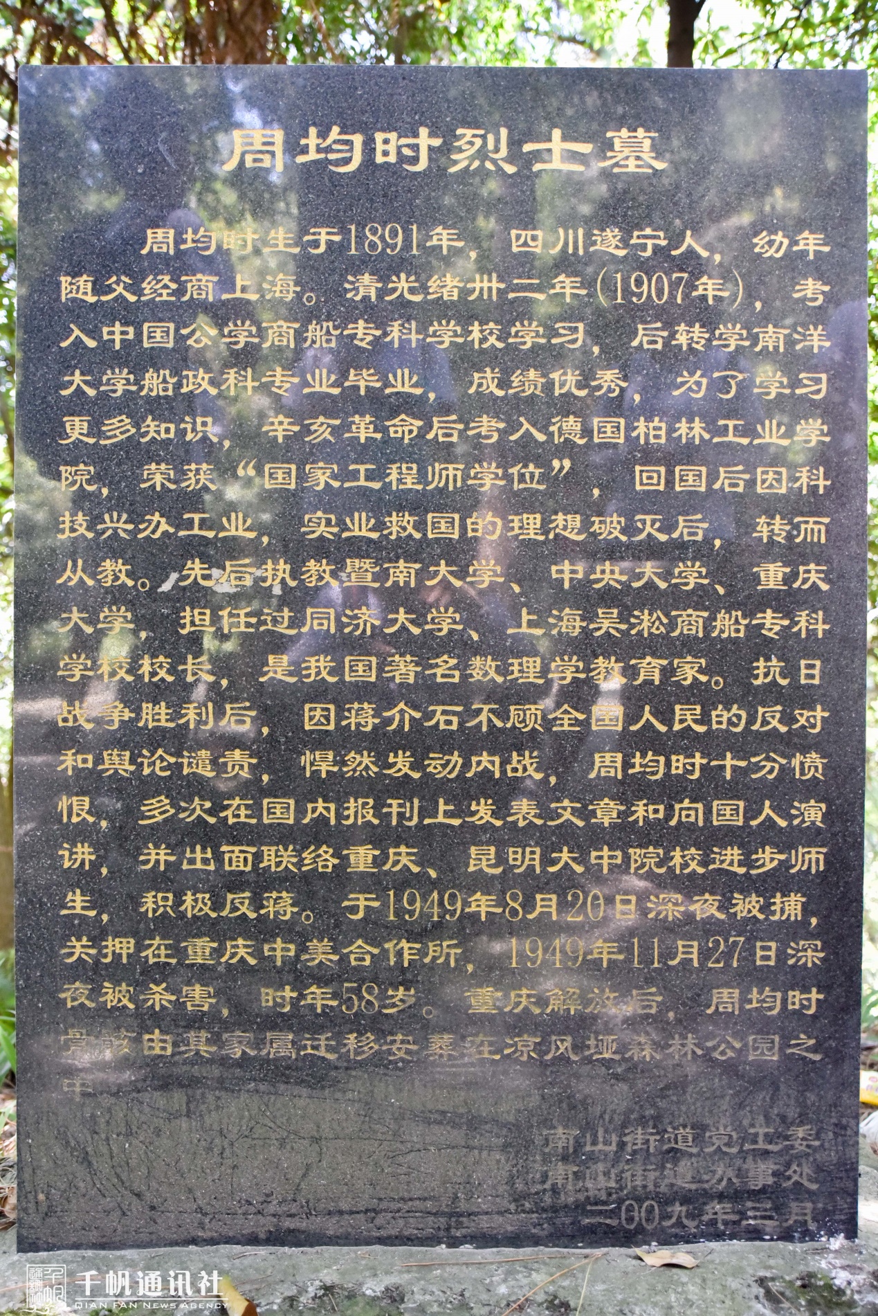 近日,为增强我校学生宣传骨干爱国爱校意识、发挥校史育人的功能,由千帆通讯社代表组成的“踏浪海江”暑期社会实践队一行前往重庆学习我校时任(1946-1949)校长周均时的光辉事迹,并祭扫位于重庆市南岸区凉风垭的周均时墓。