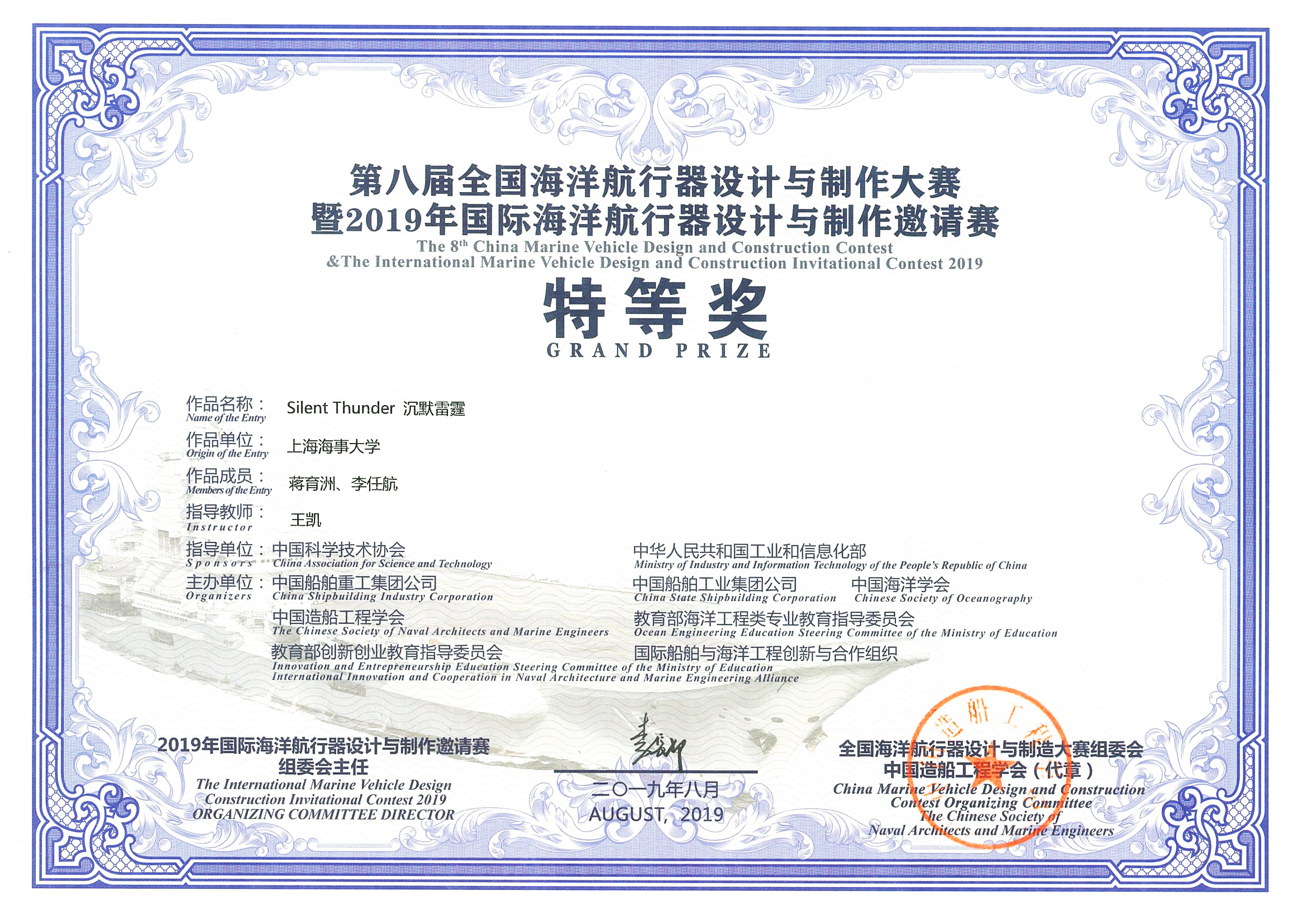 我校学生在第八届全国海洋航行器设计与制作大赛暨2019年国际海洋航行器设计与制作邀请赛中获特等奖