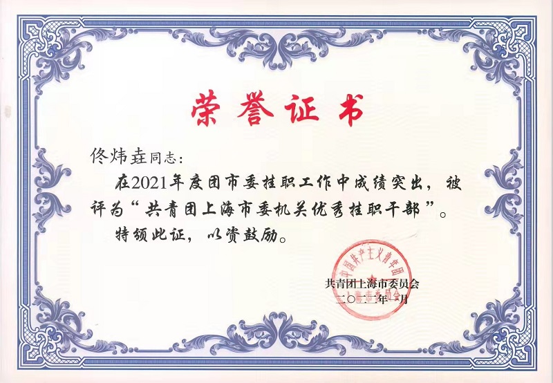 1月28日,共青团上海市委机关举行“团市委机关2021年度总结表彰会”,学校辅导员佟炜垚获得“共青团上海市委机关优秀挂职干部”荣誉。