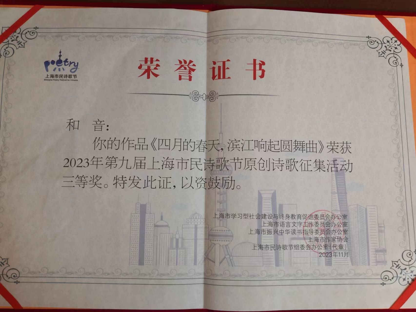 10月26日晚,“诗的江南,诗的嘉定”——2023年第九届上海市民诗歌节原创诗歌颁奖仪式和诗歌朗诵会在嘉定古猗园同时举行。学校国际教育学院何雪英副教授以笔名“和音”投稿参赛的作品《四月的春天,滨江响起圆舞曲》获得三等奖。