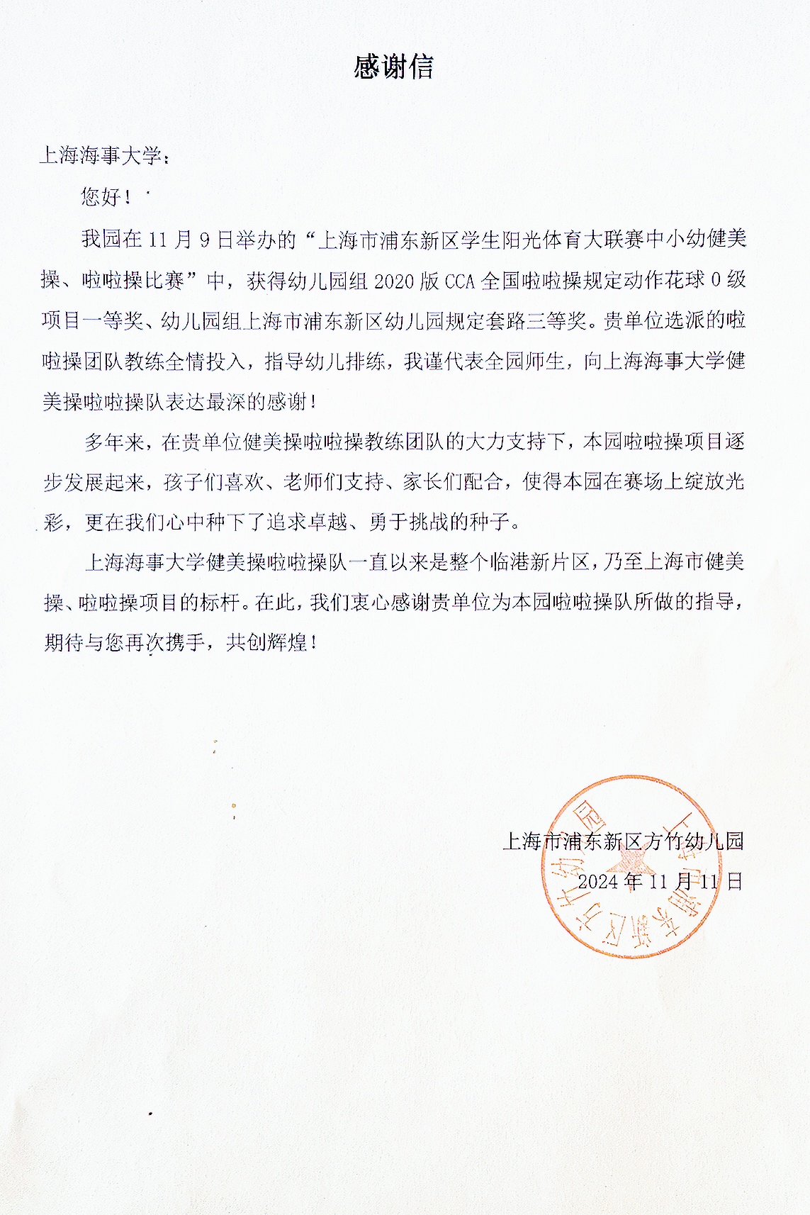 11月11日至15日,学校陆续收到了来自临港多所学校的感谢信,学校健美操啦啦操队因带领临港啦啦操联盟四校在2024年上海市浦东新区学生阳光体育大联赛中取得佳绩,受到参赛临港学校的好评。