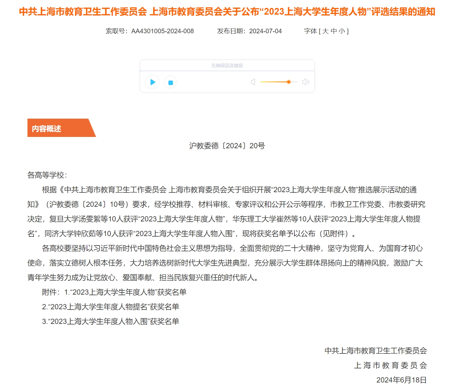 学校交通运输学院匙逸然同学获评“2023上海大学生年度人物”