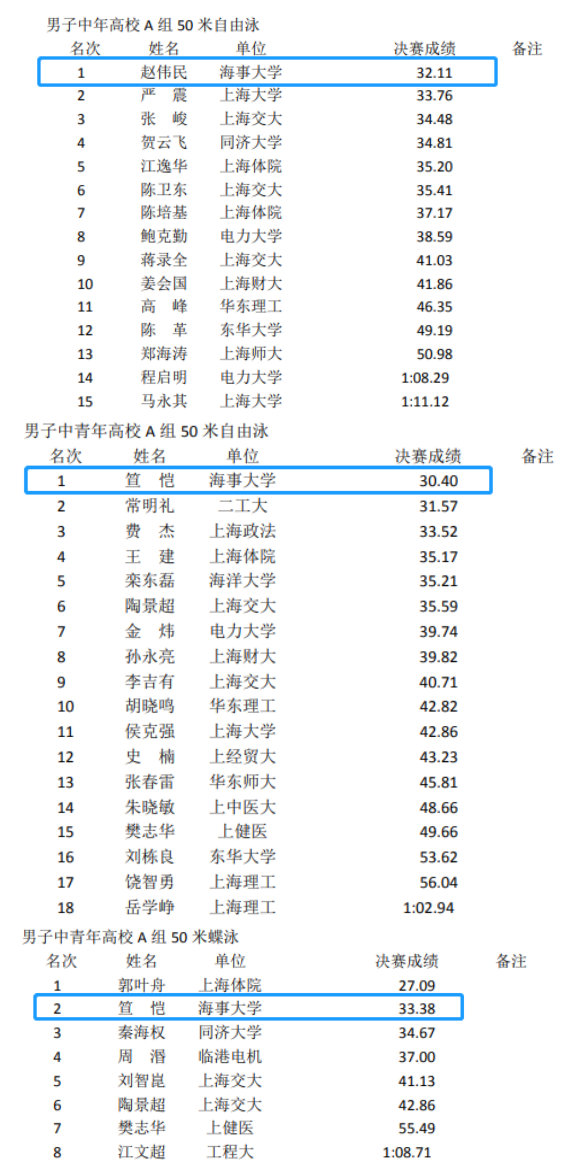 经过激烈的角逐,学校赵伟民获男子中年高校A组50米自由泳金牌,笪恺获男子中青年高校A组50米自由泳金牌和男子中青年高校A组50米蝶泳银牌。参赛运动员们身形矫健,如蛟龙入水,“泳”往直前,在泳池内掀起一阵阵浪花,发扬了海大教职工“泳”于拼搏的体育精神。