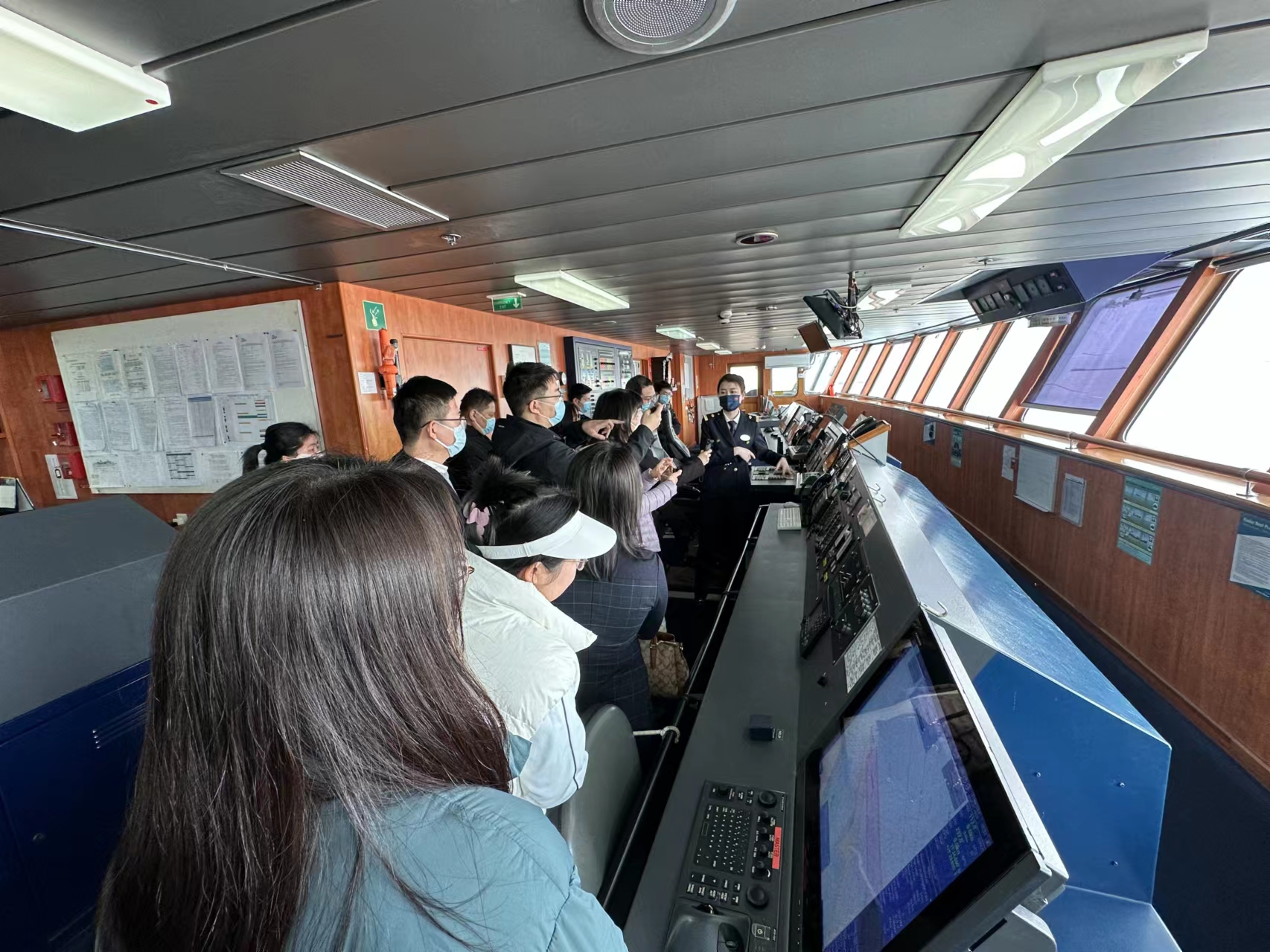 参训教师在船员的带领下,近距离实地参观了驾驶台、轮机舱、客舱、罗经甲板等船舶主要场所,初步了解了船舶操纵及雷达导航设备、机舱动力装置、制冷空调及海水淡化装置等船舶仪器设备。随后,参训教师一同观摩了“蓝海研习社之中国近代航海史”主题展览。
