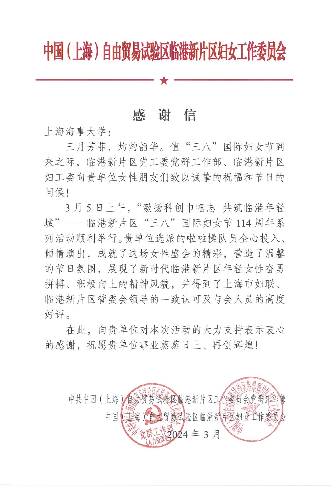 近日,学校收到来自临港新片区党工委党群工作部和妇女工作委员会的感谢信,感谢学校选派的啦啦操队员在临港新片区“三八”国际妇女节114周年主题活动的倾情演出,展现了新时代临港新片区女性奋勇拼搏、积极向上的精神风貌。