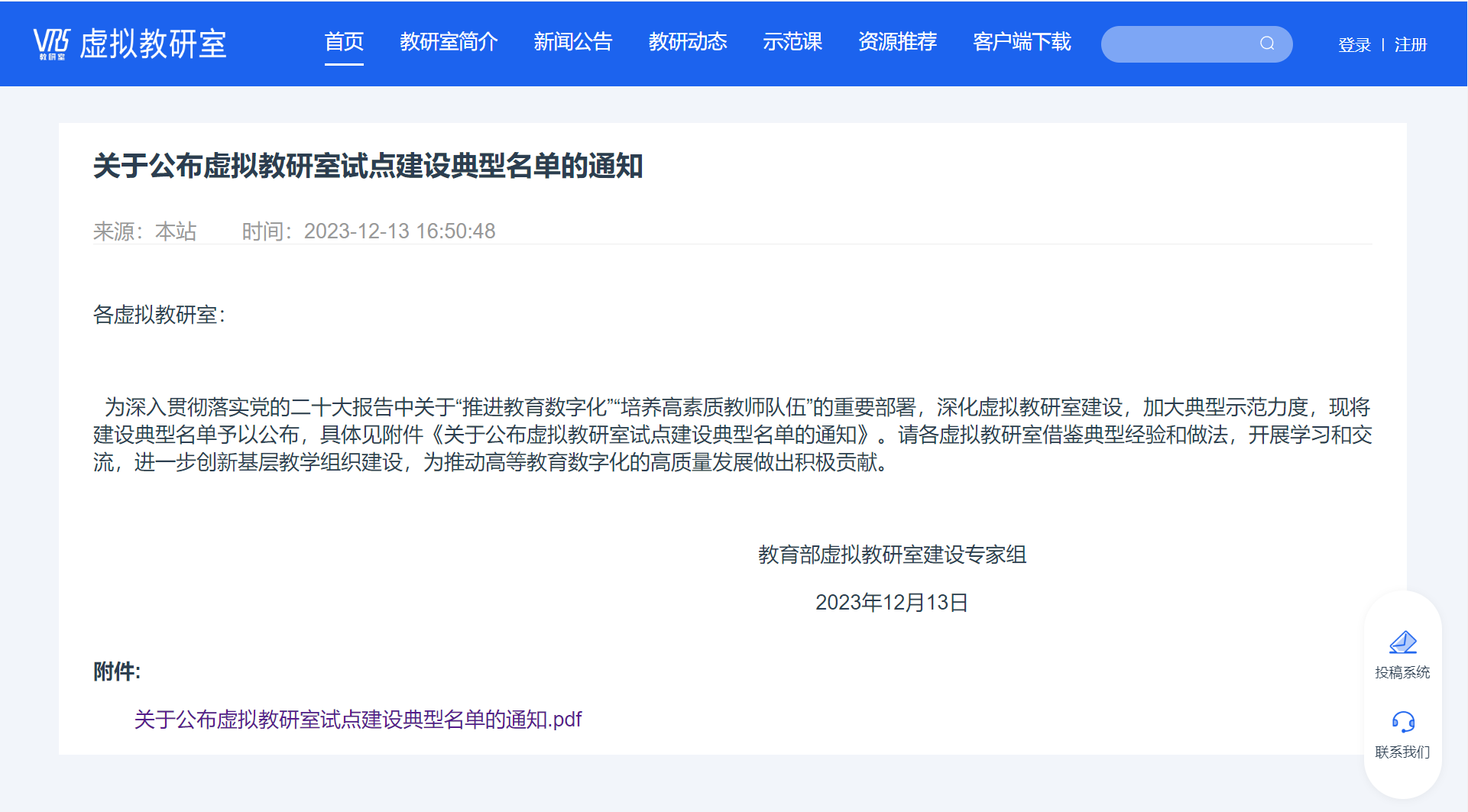 为深入贯彻落实党的二十大报告中关于“推进教育数字化”“培养高素质教师队伍”的重要部署,深化虚拟教研室建设,加大典型示范力度,虚拟教研室建设专家组开展了典型虚拟教研室、典型教研方法、典型教研成果选树工作。基于各虚拟教研室年报数据,经学科协作组推荐、虚拟教研室建设专家组论证等工作程序,形成虚拟教研室试点建设典型名单,其中典型虚拟教研室50个、典型教研方法100项、典型教研成果50项。