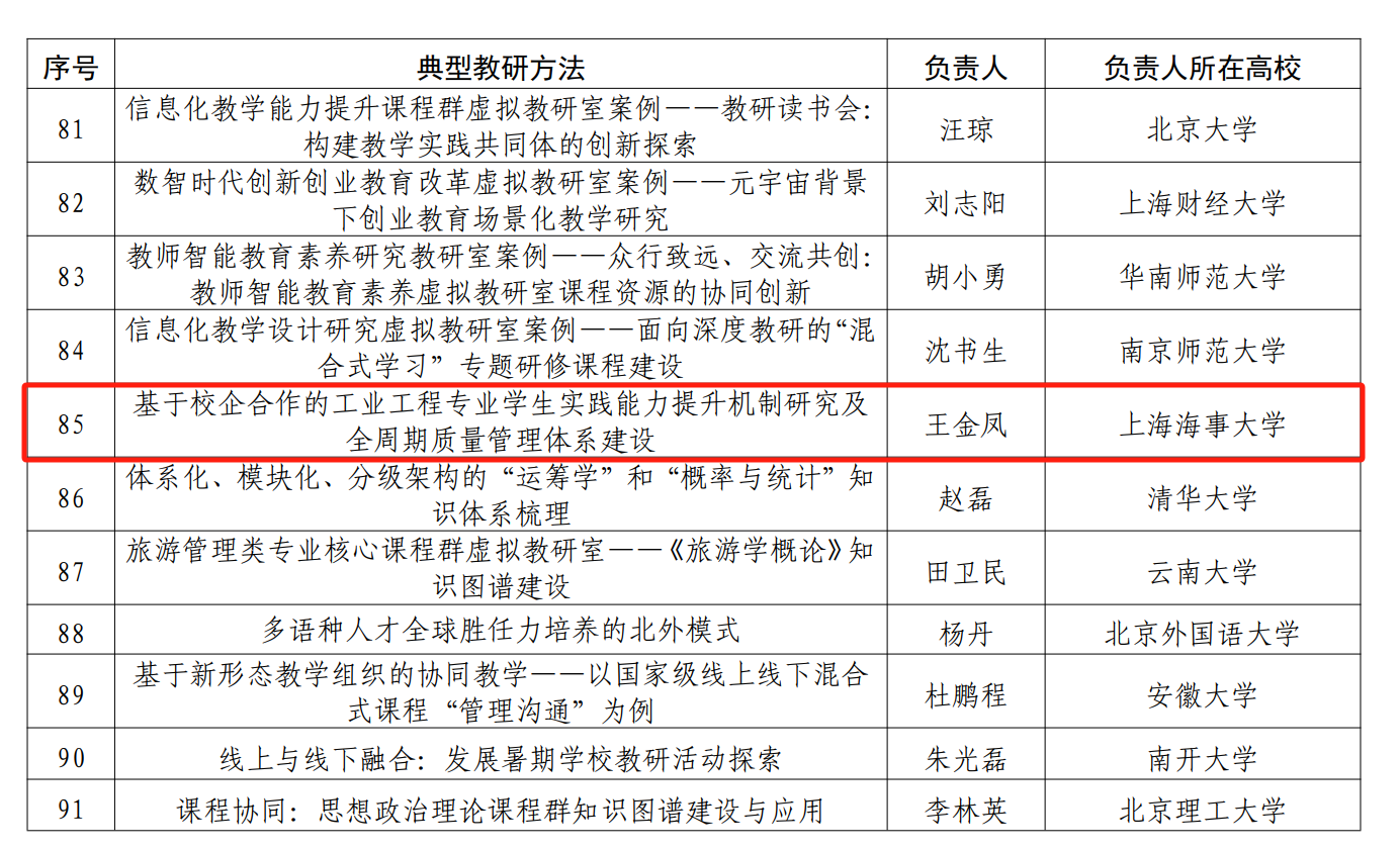 近日,教育部虚拟教研室建设专家组公布了“虚拟教研室试点建设典型名单”。学校牵头建设的“工业工程专业实践教学研究虚拟教研室”在2023年建设进度考核中提交的建设成果——“基于校企合作的工业工程专业学生实践能力提升机制研究及全周期质量管理体系建设”入选建设典型名单,类型为典型教研方法,是我国工业工程领域入选的两个虚拟教研室之一。