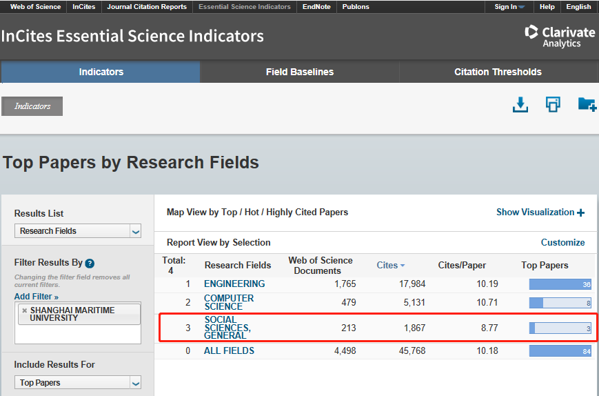 “社会科学总论”是继学校工程学和计算机科学两个学科进入ESI全球前1%之后,又一个进入国际高水平行列的学科,是学校社会科学快速发展取得的新突破。根据ESI数据显示,上海海事大学近十年在ESI“社会科学总论”共发表SCIE和SSCI论文213篇,总被引频次为1867,篇均被引频次为8.77。