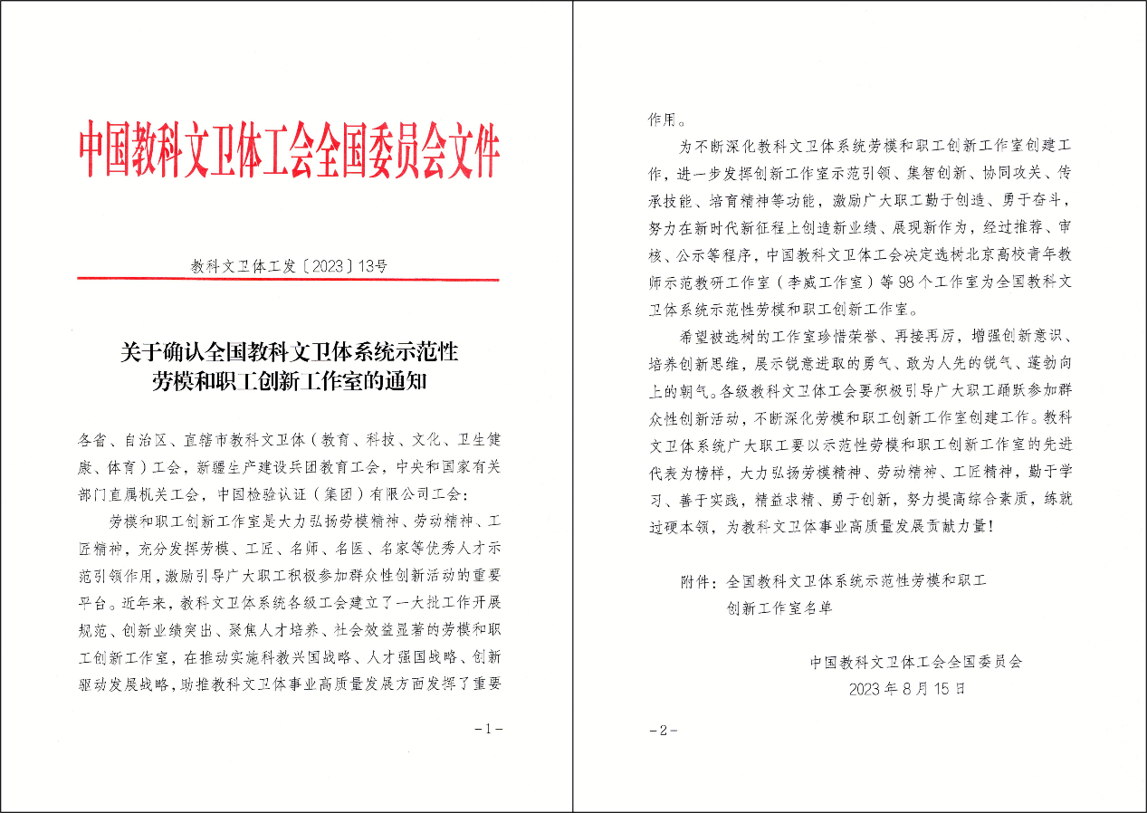 近日,中国教科文卫体工会全国委员会下发《关于确认全国科教文卫体系统示范性劳模和职工创新工作室的通知》,学校施欣劳模创新工作室入选。