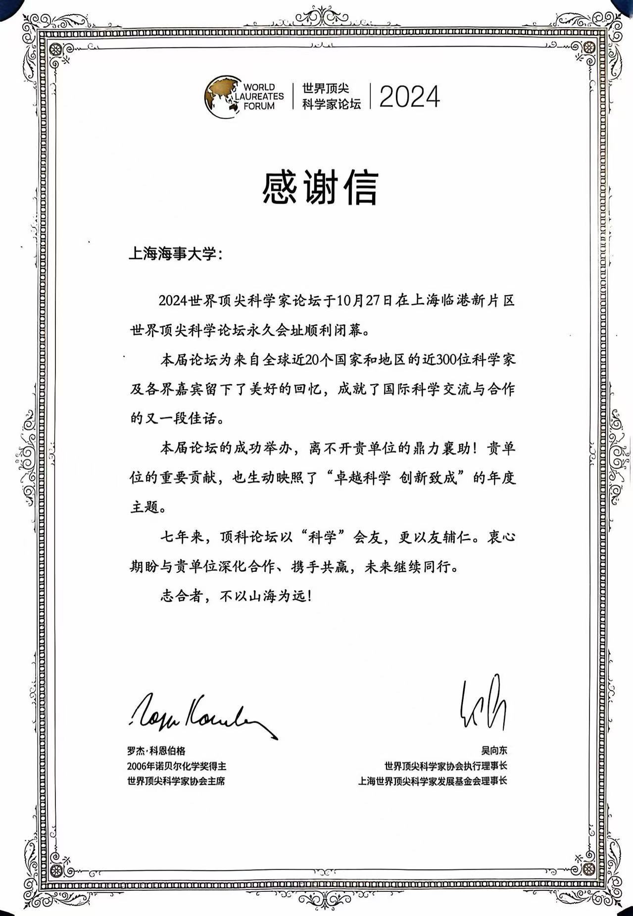 学校收到2024世界顶尖科学家论坛协会的感谢信