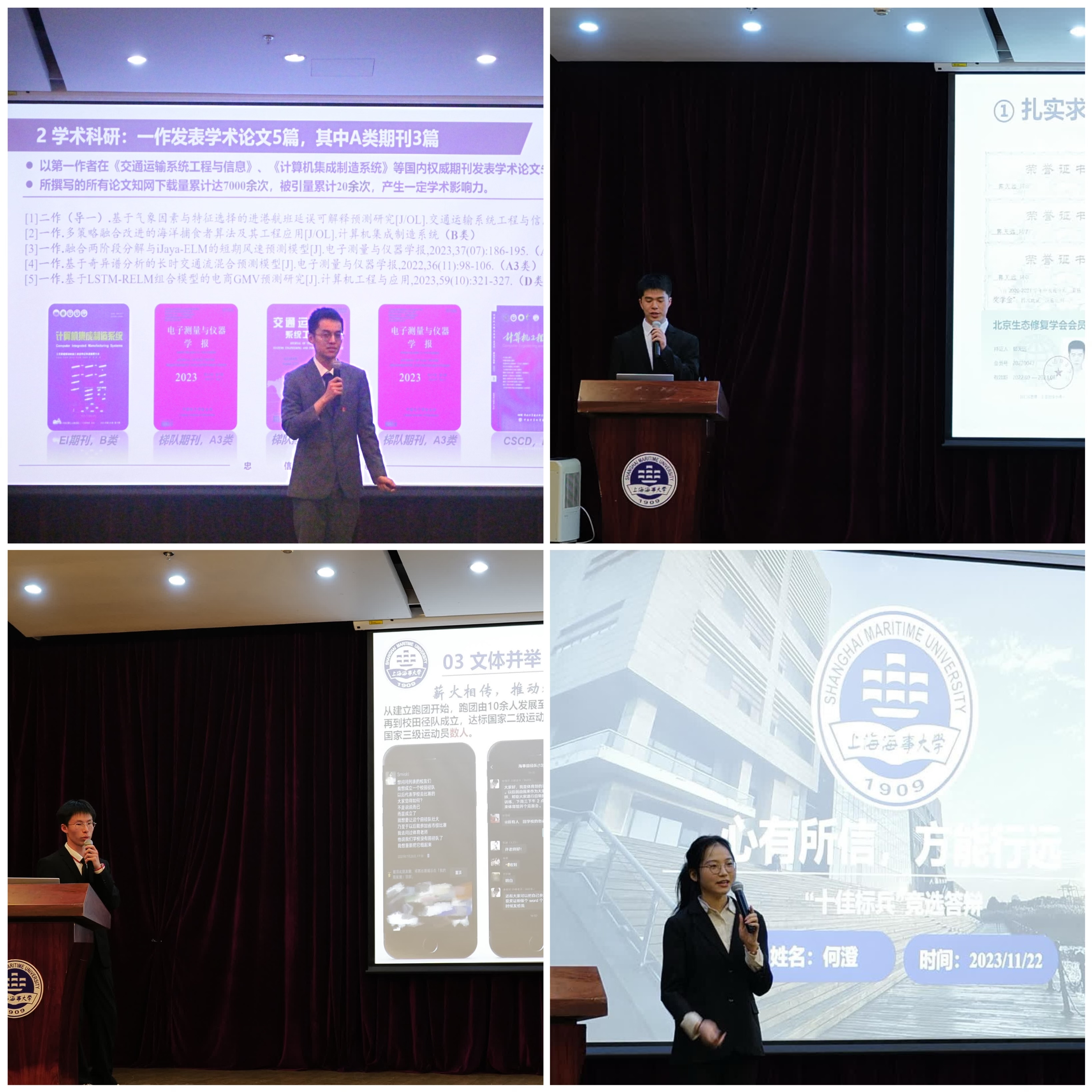 经过激烈角逐,结合前期线上投票、现场专家评审和学生代表现场投票综合得分情况,屈优优、郭天远、翟赞、王逸文、杨依灵、何澄、孙佳钰、莫俊龙、钟印红和董政10位同学被评为2022-2023学年上海海海事大学“十佳标兵学生”。