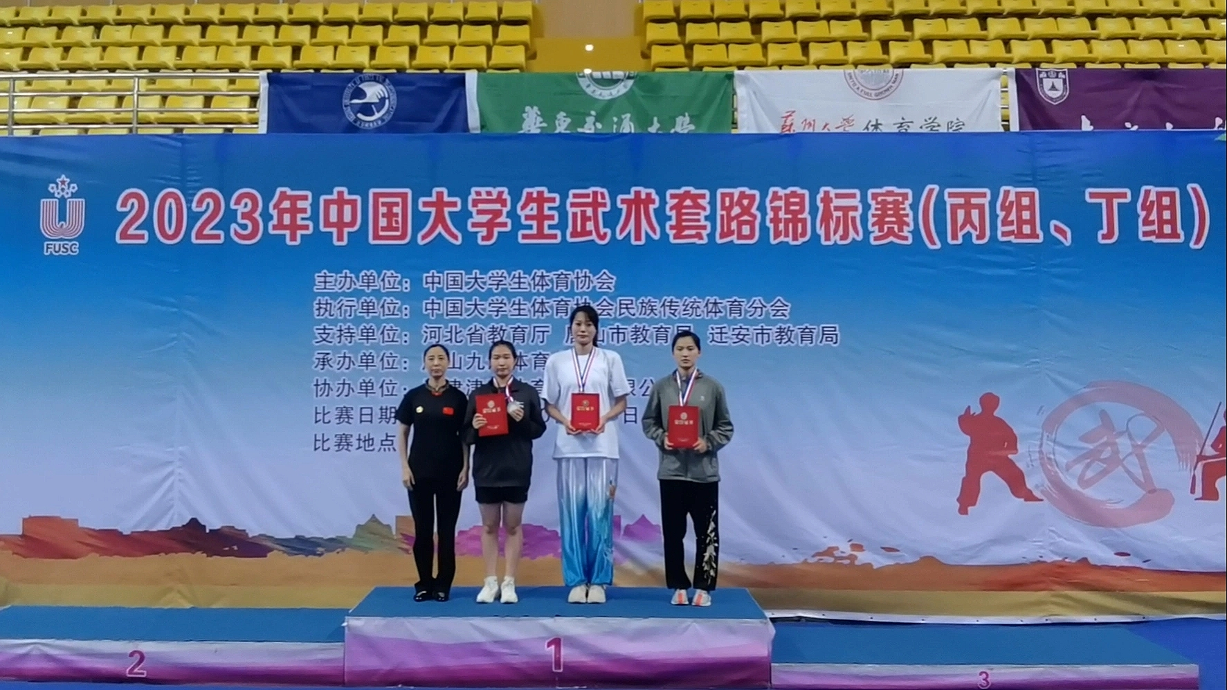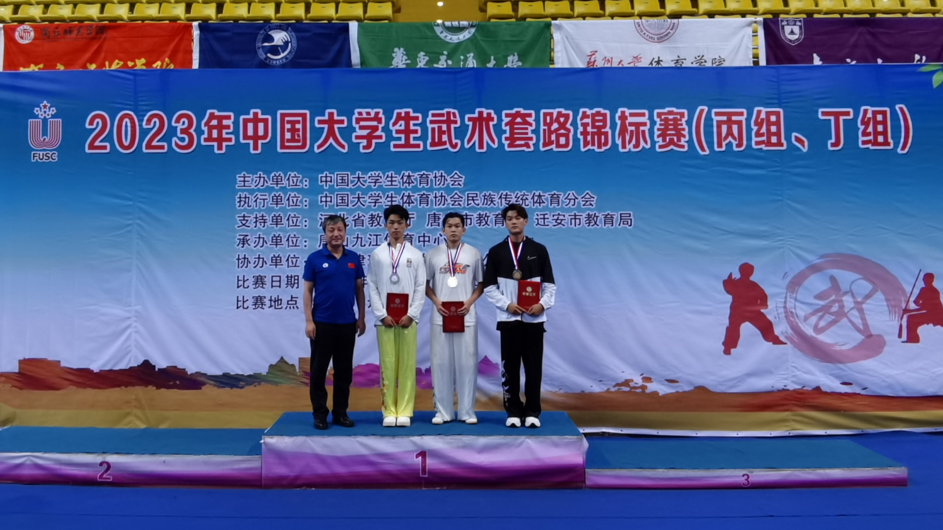 2023年7月10日至16日,2023年中国大学生武术套路锦标赛(丙组、丁组)在河北省唐山市迁安九江体育中心举行。此次比赛吸引了复旦大学、浙江大学、北京理工大学等55支代表队、近410名大学生运动员参赛。