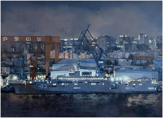黄菁菁老师的作品《启航》结合学校行业特色,充分展现了上海沪东中华造船厂制造的两栖攻击舰建造的场景,这不仅仅是上海的骄傲,更是整个中国船舶制造业的典范。这艘舰船的建造标志着中国造船技术的飞速发展和成熟,提升了中国海军的整体装备,展现出中国在国防领域的强大实力,为国家和平与稳定起到了积极的作用。