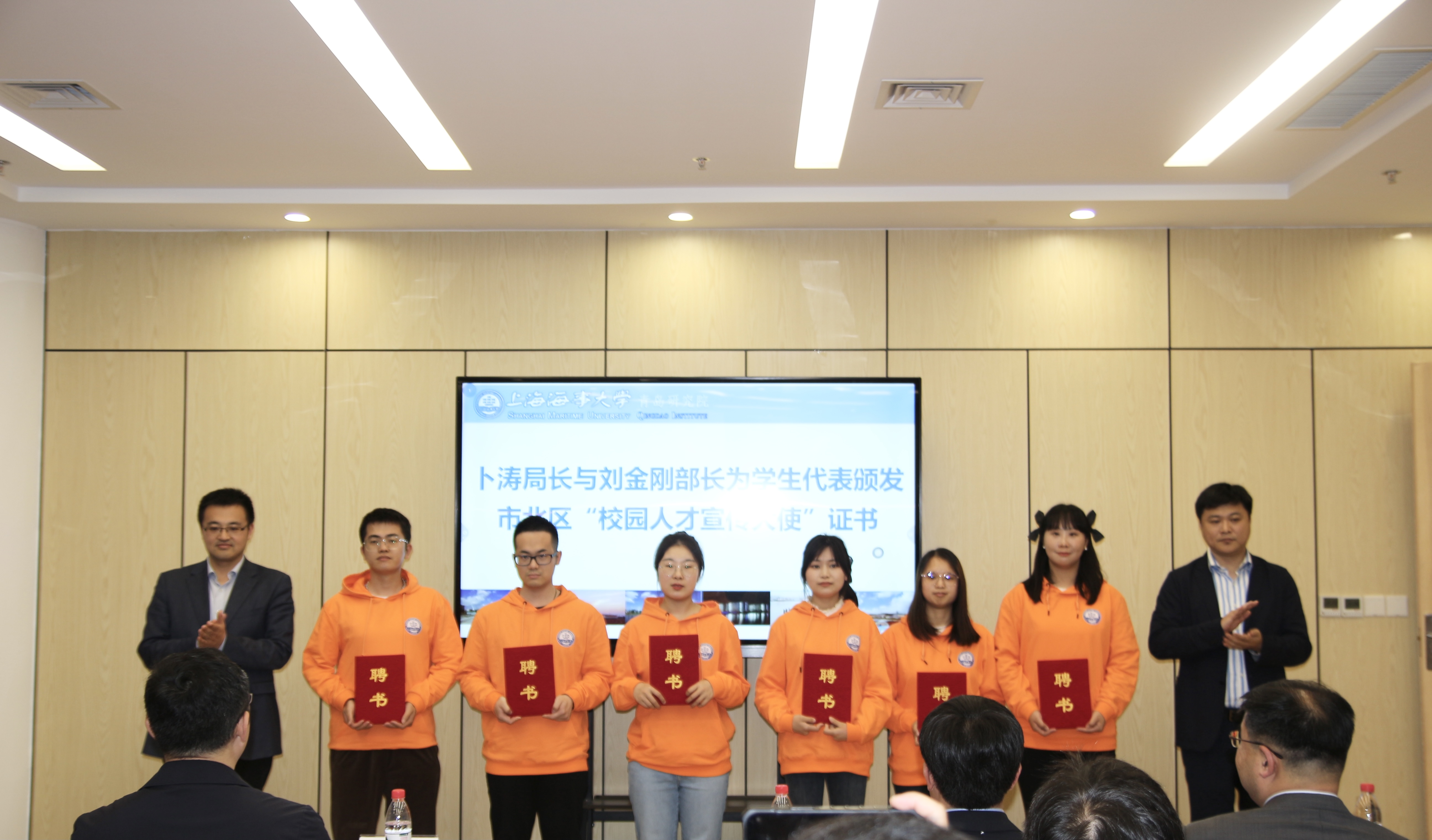 会上,卜涛与刘金刚为学生代表颁发市北区“校园人才宣传大使”证书。黄睿为研究生们深入解读市北区“北尚英才”计划。