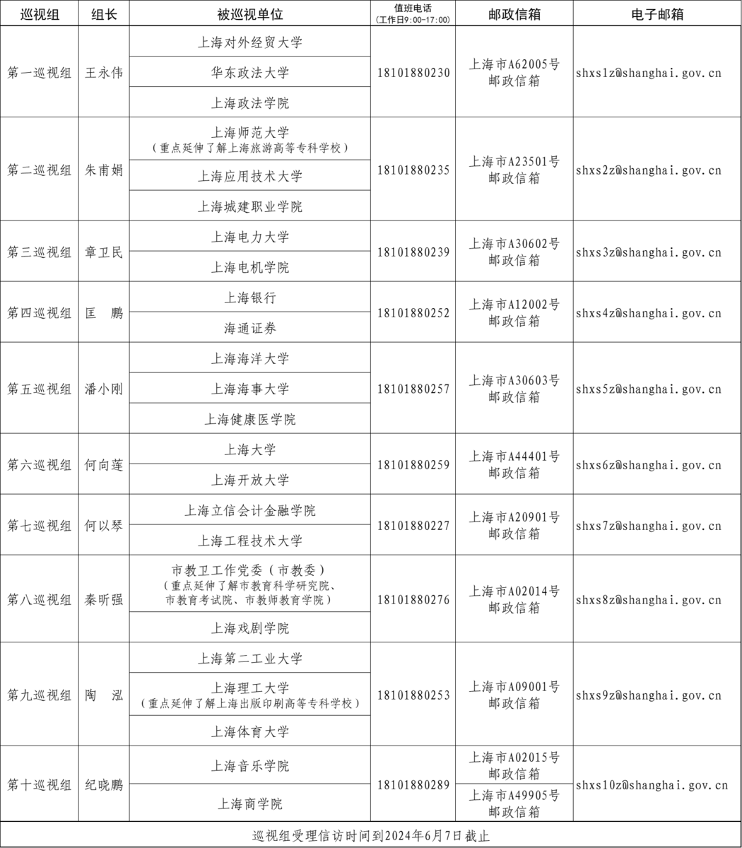 巡视期间,市委巡视组设值班电话和专用邮政信箱,主要受理反映被巡视党组织领导班子及其成员和下一级党组织领导班子主要负责人问题的来信来电来访,重点是关于违反政治纪律、组织纪律、廉洁纪律、群众纪律、工作纪律、生活纪律以及巡视整改方面问题的举报和反映。另外,还通过“码上巡”系统设置了二维码,方便干部群众反映问题。本轮巡视受理信访时间到2024年6月7日截止。