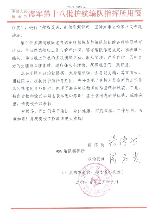 近日,中国海军第18批护航指挥员张传书少将和编队政治委员周名贵少将代表海军南海舰队,专门致信上海海事大学,对学校派出涂兴华船长全力配合做好护航工作表示衷心感谢,对7个多月来与海军官兵并肩作战,恪尽职守,任劳任怨,为编队圆满完成护航任务做出突出贡献的涂兴华船长表示崇高的敬意。