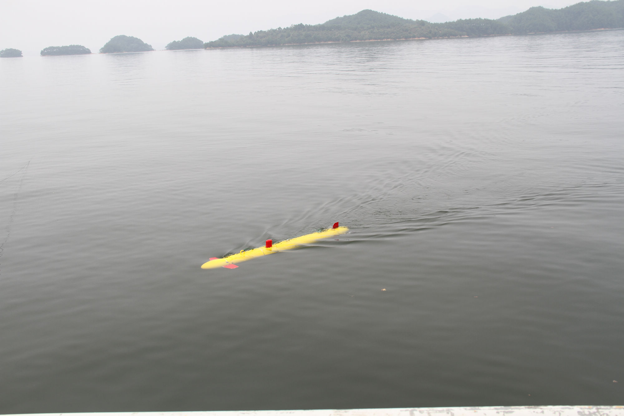 “海事金枪鱼”自主式水下机器人长2.4米;舱体直径0.24米;重量80公斤;最大航速4节(2米/秒左右);最大工作深度是100米;在3节航速下,工作时间大于4小时。该型自主式水下机器人仅需采用一台标准的便携式电脑,即可下达操作指令,实现GPS导航下的水面自主航行以及惯性导航下的水下自主航行。