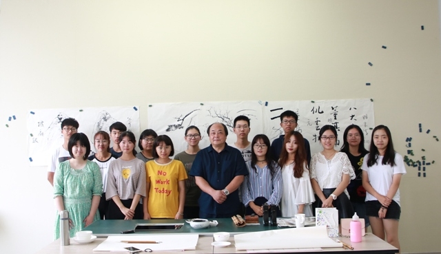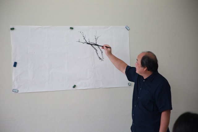 宣纸、毛笔、徽墨、歙砚是乐震文教授上课时用的教具。乐震文在课上谈到,中国绘画从一定意义上讲就是水墨画,国画是中国真正的艺术,这种艺术对许多亚洲国家的绘画历史产生深远影响。它与西洋画最大的区别就在于线条,线条是中国画的根本和精髓,线条的粗细、轻重、浓淡等技法,构成国画别具一格的韵味,中国画讲究的是意境;而西洋画强调画面、色彩、光线、环境等,更讲究写实。他还以八大山人、董其昌、倪云林等线条技法造诣极高的艺术大师为例,强调线条在中国画中的地位高于其表达的形象。同时,乐震文通过现场演示、为学生们讲解了“披麻皴”“斧劈皴”和颜真卿的“屋漏痕”等线条技法,深入浅出的阐述,让同学们充分领悟到线条对中国绘画的重要性。