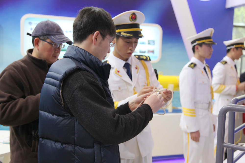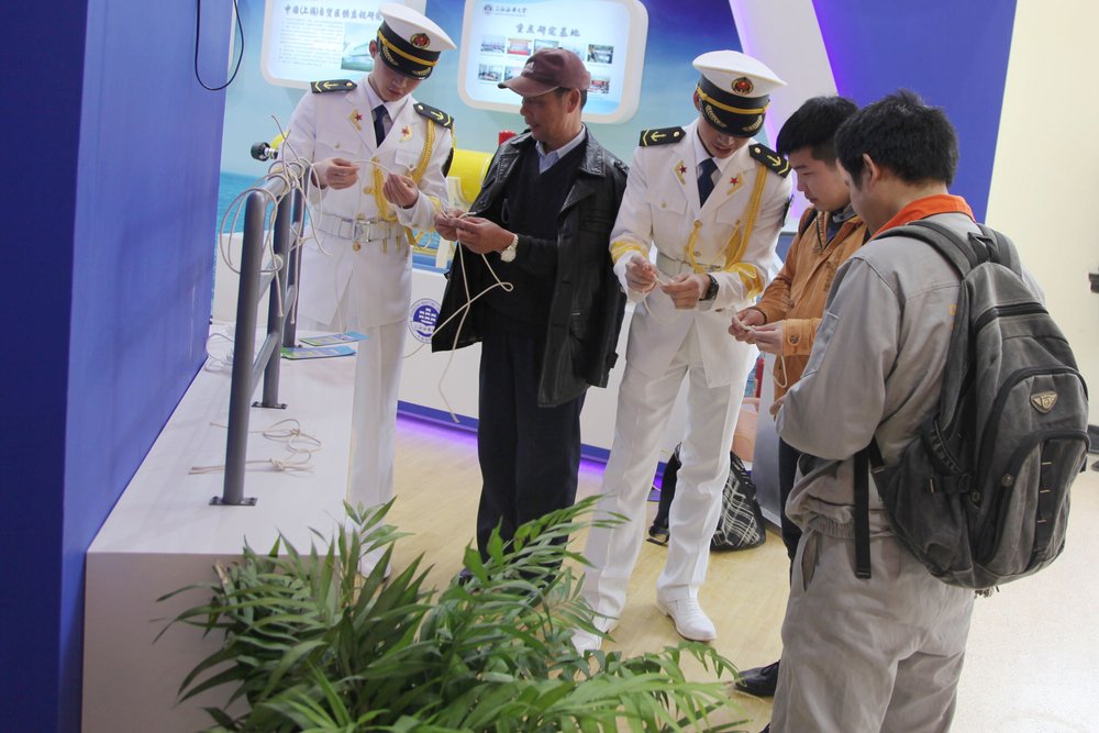 我校展位吸引了不少观众驻足,参展工作人员耐心为考生、中小学生及其家长提供相关咨询;志愿者们现场与观众们积极互动,教授他们打“水手结”,弘扬了航海文化,同时也展现了我校莘莘学子良好的精神风貌。
