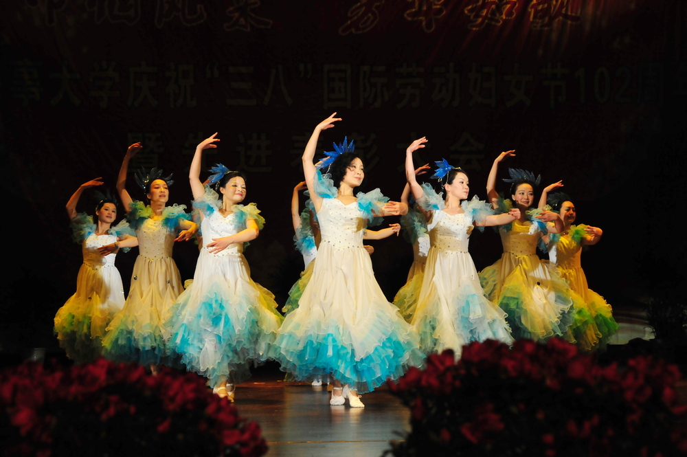 去年,在上海海事大学庆祝“三八”国际劳动妇女节102周年暨先进表彰大会的舞台上,女教职工舞蹈队的演员们伴随着华尔兹舞曲《蓝色多瑙河》翩翩起舞,学生舞蹈团表演的舞蹈《花儿为什么这样红》充满青春活力,女声小合唱《大红枣》、《思念》优美抒情,教职工的系列时装秀典雅大方。