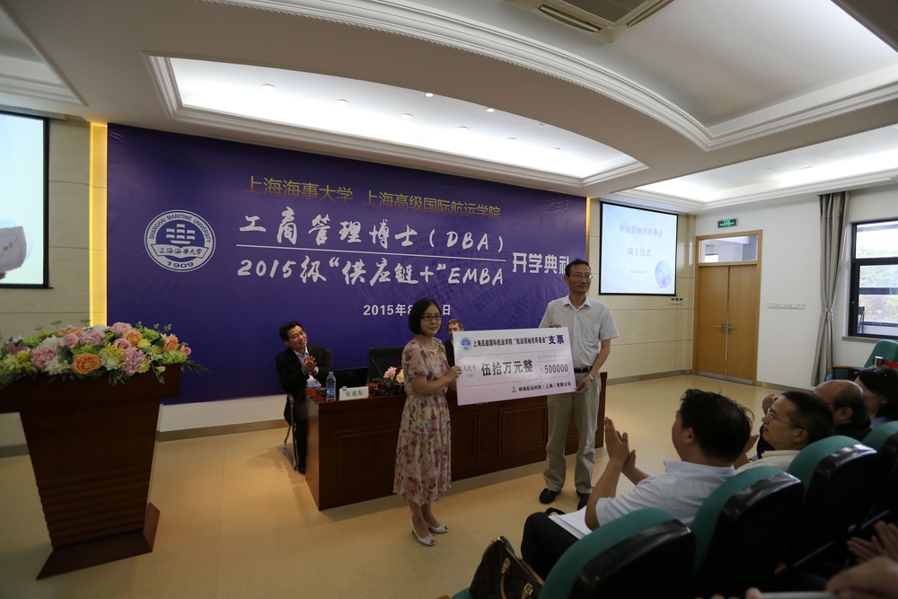 会上还进行了上海高级国际航运学院“航运领袖培养基金”的成立仪式,神海航运科技(上海)有限公司董事长苏海霞作为首批基金捐赠者向学院赠送了50万元的基金支票,黃有方校长代表学院接受捐赠。