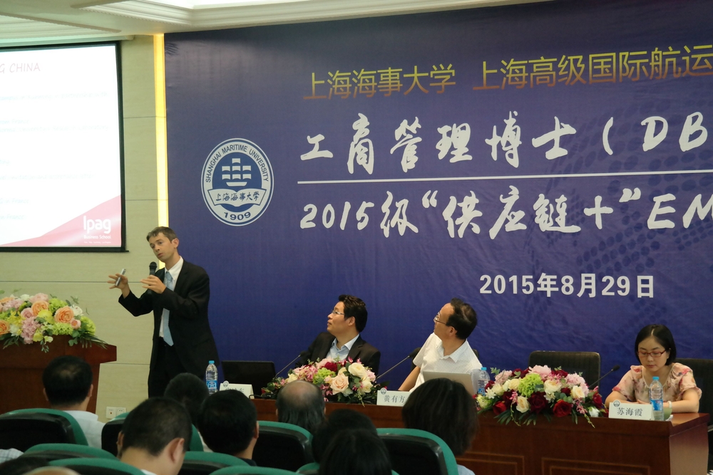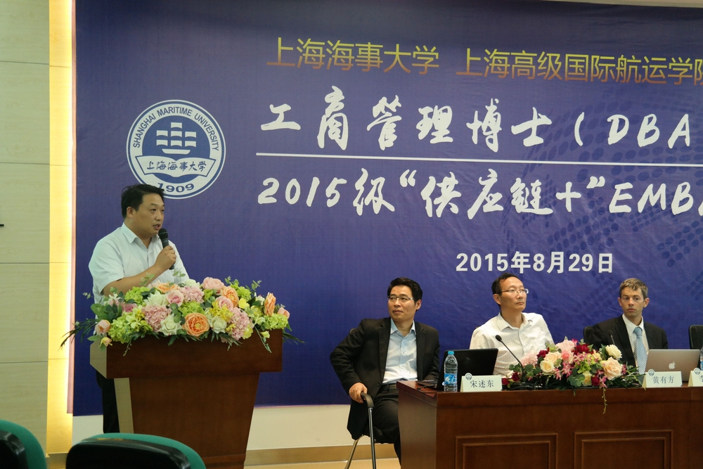 8月29日,上海海事大学上海高级国际航运学院工商管理博士(DBA)暨2015级“供应链+”EMBA开学典礼在东明路校区举行。上海海事大学黃有方校长、法国IPAG商学院DBA项目中国区代表Raphael Lissillour(李道安)先生、上海交通大学新儒商书院宋述东教授、以及来自全国港航、物流企业的60名新生出席了典礼。开学典礼由上海高级国际航运学院常务副院长余思勤教授主持。