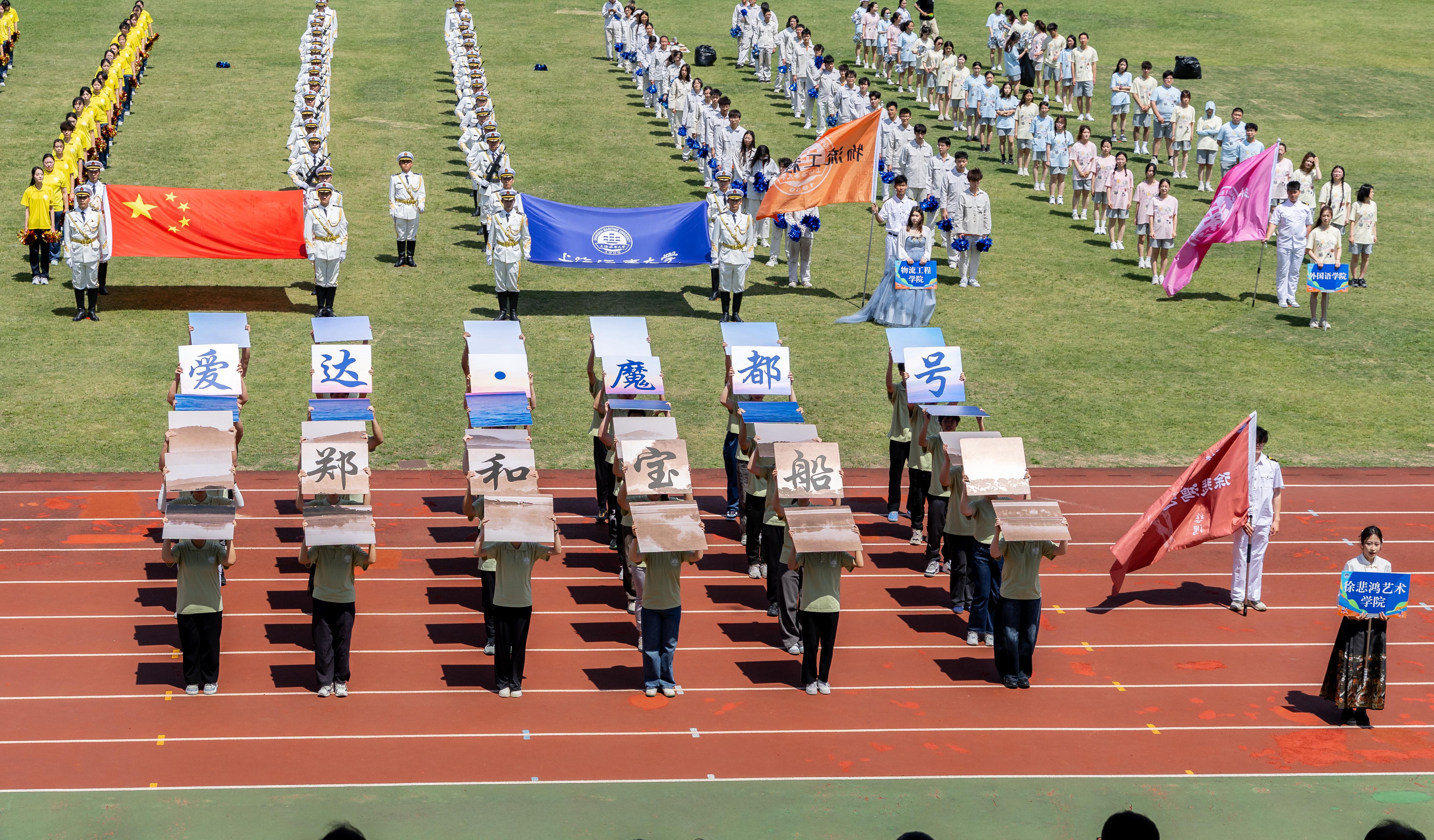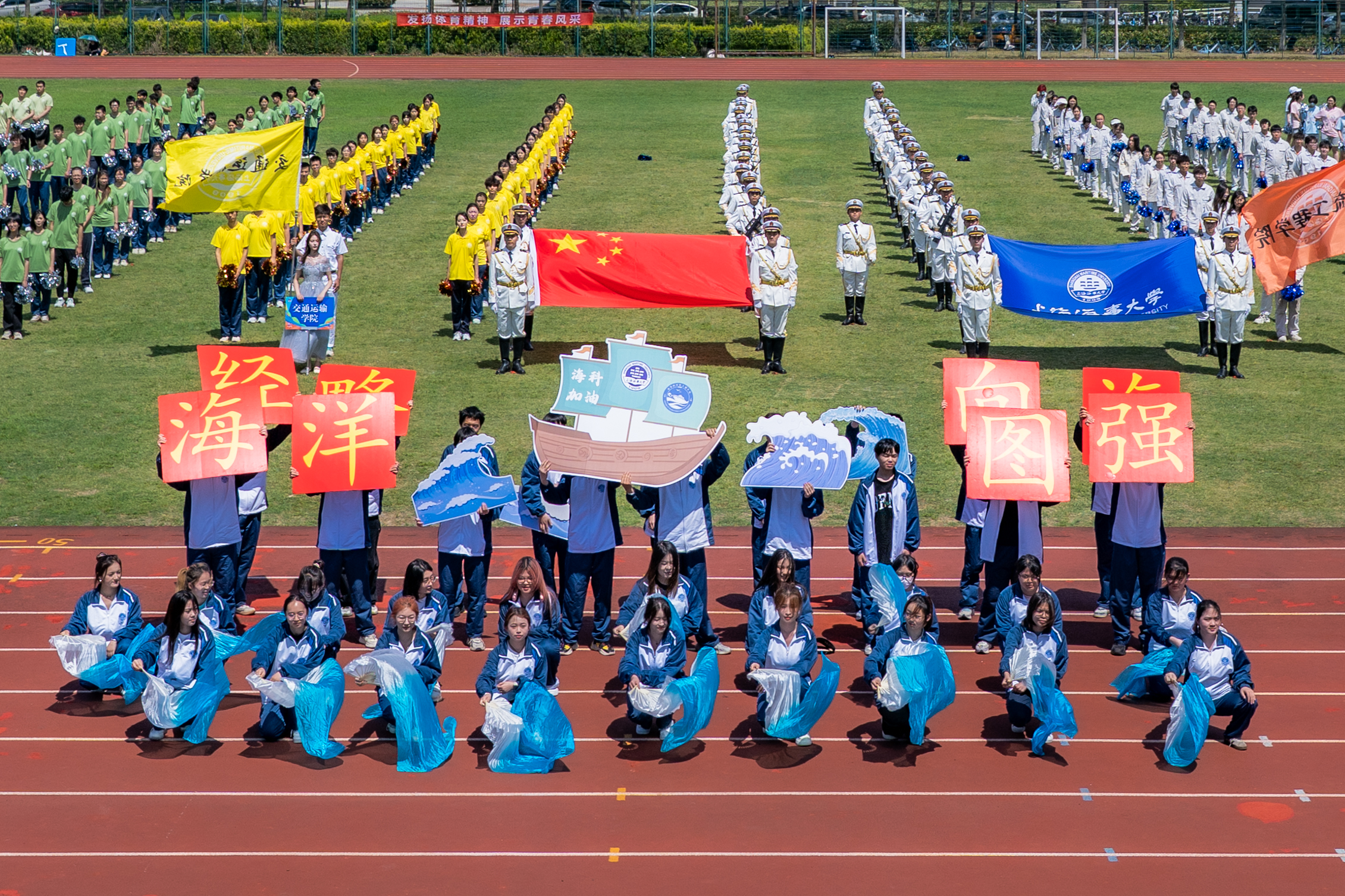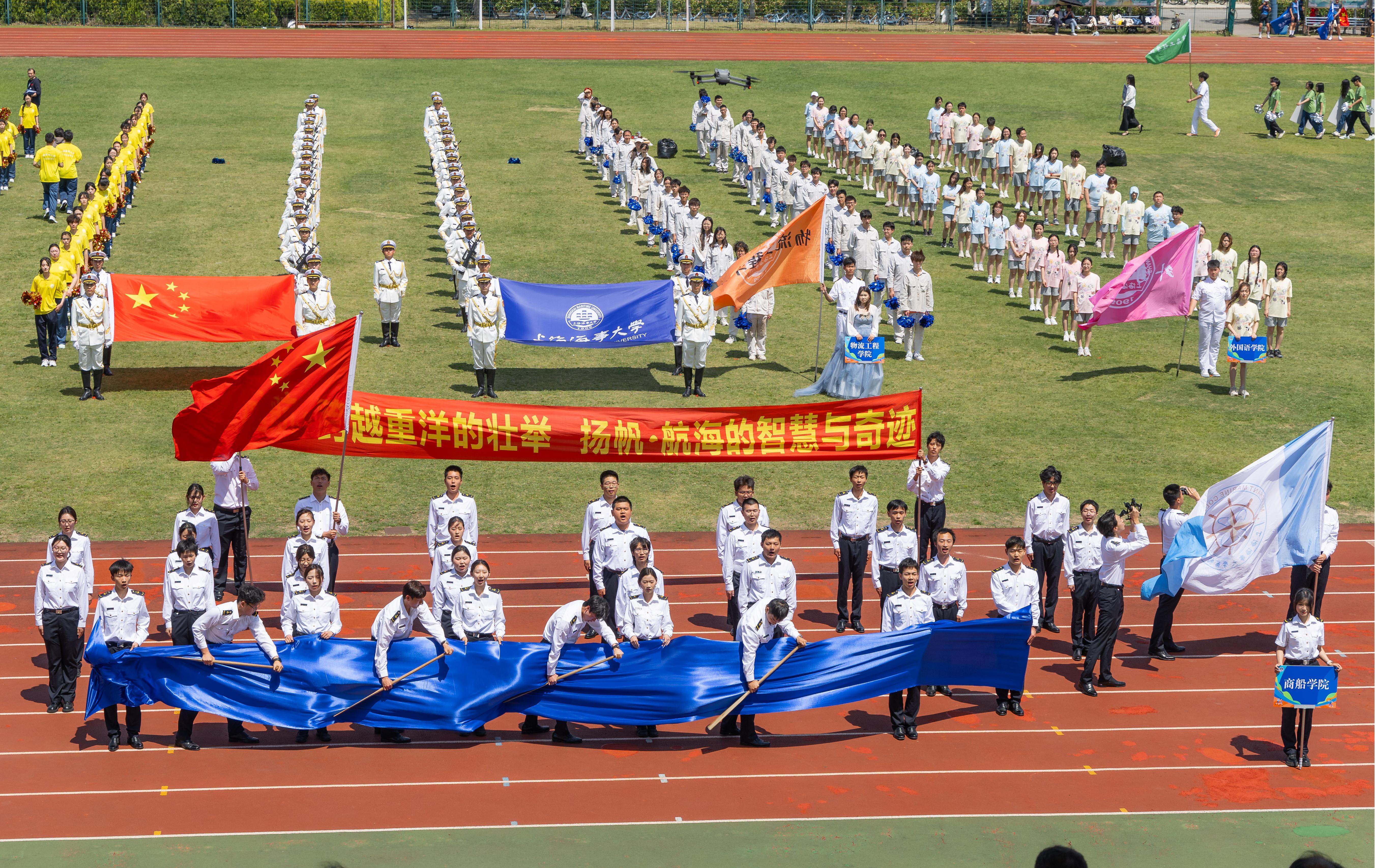开幕式在气势磅礴的《歌唱祖国》歌声中拉开序幕。12个学院方阵依次登场,充分展现了上海海事大学师生昂扬向上、勇于创新的精神风貌。商船学院致敬郑和远航精神,彰显新时代航海人破浪向前、续写星辰的壮志;交通运输学院步伐铿锵、气势如虹,如巨轮劈波斩浪,逐梦远航;经济管理学院以丝绸商路为卷,书写新时代贸易华章;物流工程学院以无人驾驶智能车、门机抓斗、航运数据算法矩阵与船舶蓝图新设计,勾勒出智慧港口建设的科技航迹;信息工程学院用代码编织未来,智启未来新篇章;外国语学院以多语为帆,借海事东风,架起中外文化交流的桥梁;理学院以数理之美丈量青春,如追光者突破极限;海洋科学与工程学院以“蓝色梦想”为引,向深蓝未来扬帆启航;法学院用法律的智慧,编织正义的经纬,绘就社会和谐的蓝图;徐悲鸿艺术学院以画笔勾勒航运巨变,融通传统与现代;物流科学与工程研究院以陆海空联动聚锋芒,如远航巨轮乘浪勇向浩瀚前方;马克思主义学院则高举信仰火炬,展现青年担当。各学院以专业特色为依托,用青春与热情点燃全场,共同构成海大田径运动会上一道道流动的风景线。