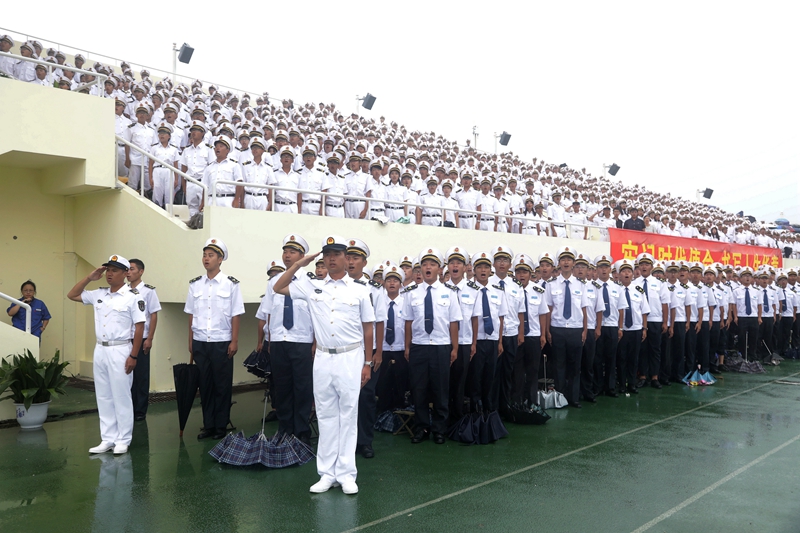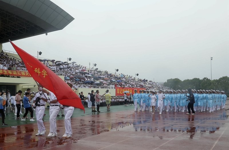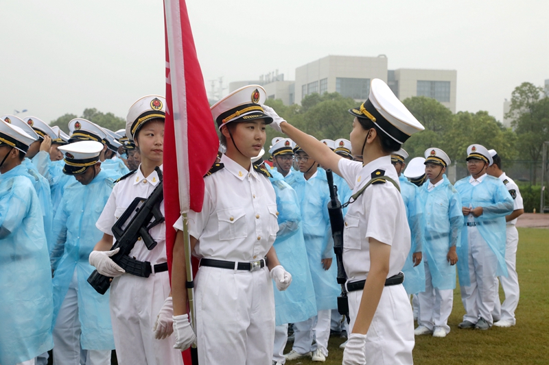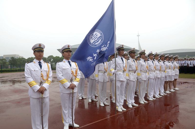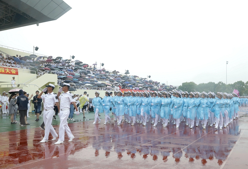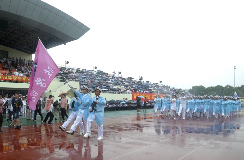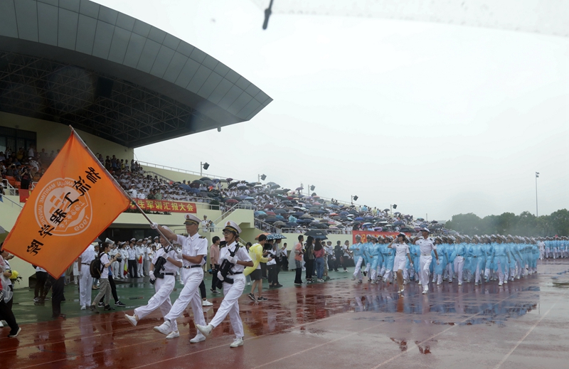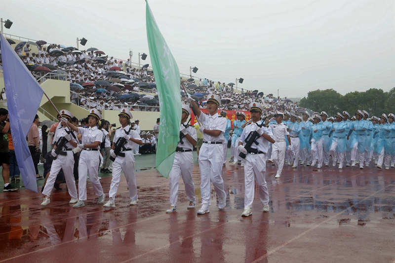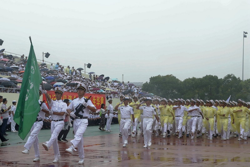 庄严的升国旗仪式后,黄有方校长在军训汇报总指挥、海军上海基地李偲上尉的陪同下,冒雨检阅了军训方队。随后,校仪仗队以及各学院的受阅方队进行了阅兵分列式。尽管下着大雨,新生军训方队依旧认真参与本次阅兵仪式,他们行列整齐、步调一致、精神饱满、口号嘹亮,踏着正步依次从主席台前走过,丝毫不受风雨的影响,赢得全场师生、教官的热烈掌声。