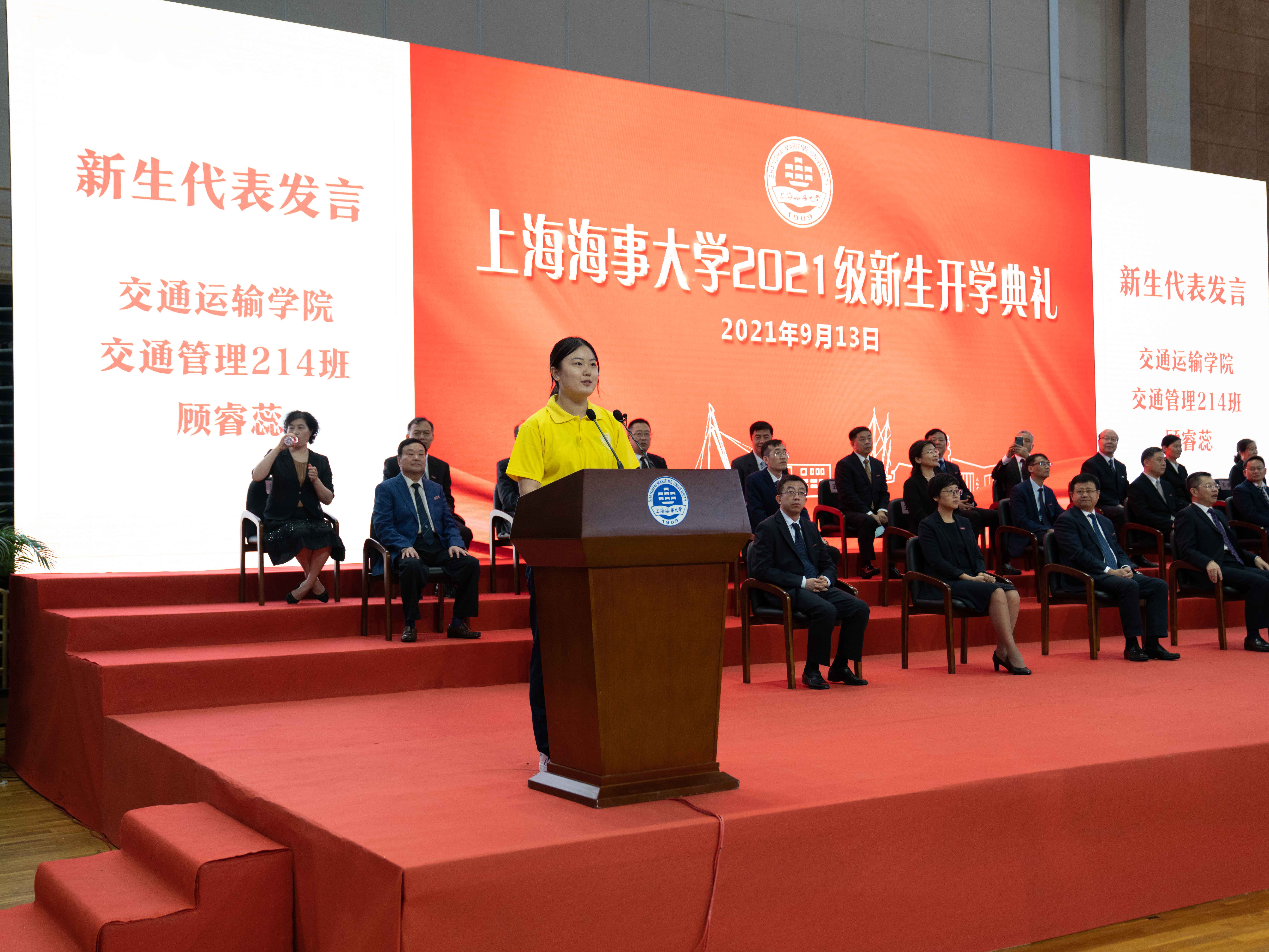 本科新生代表、交通运输学院交通管理专业214班的顾睿蕊发言,表示作为新一代青年人,将会认真学习,踏上起航的“育明”轮,成为一个能为航运强国建设做出贡献的人,为国家的复兴和发展奉献青春的人。