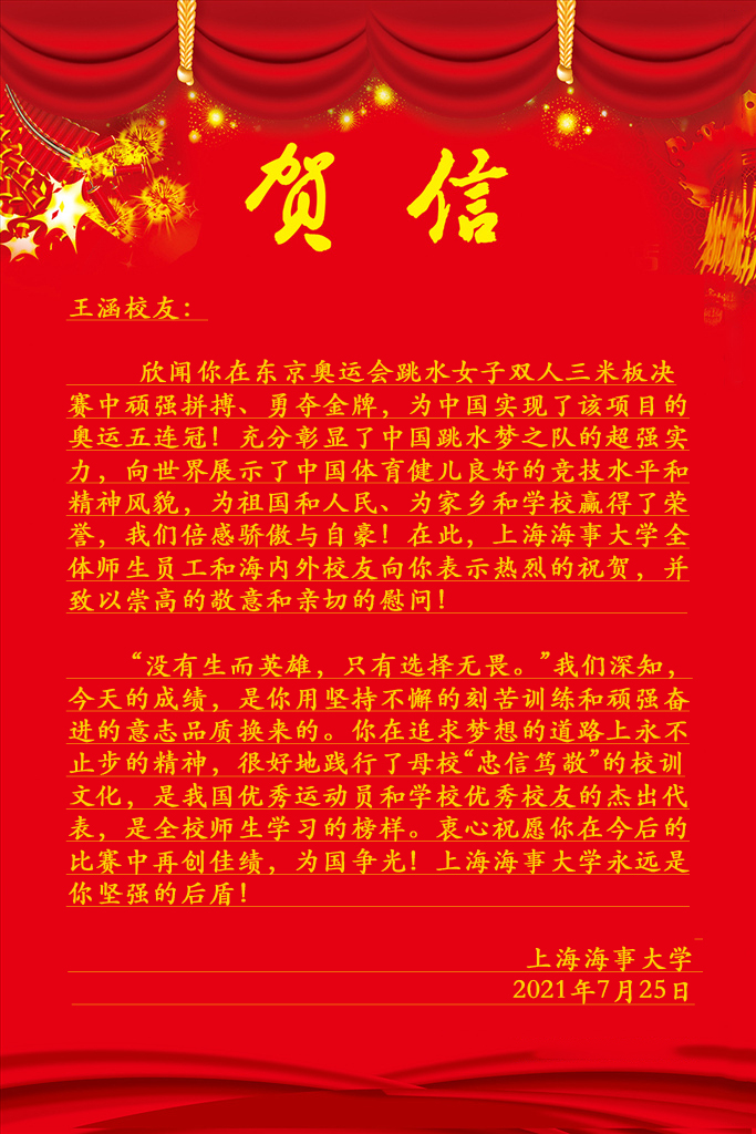 学校第一时间向王涵本人发去了贺信,代表全体师生员工和海内外校友向王涵表示热烈祝贺和亲切慰问。贺信指出,王涵在追求梦想的道路上永不止步的精神,很好地践行了母校“忠信笃敬”的校训文化,是我国优秀运动员和学校优秀校友的杰出代表,是全校师生学习的榜样。贺信最后衷心祝愿王涵在今后的比赛中再创佳绩,为国争光!学校永远是校友坚强的后盾!