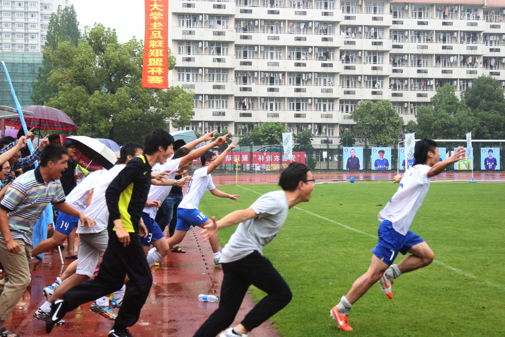 决赛当天,大雨丝毫没有减少双方球员和观众的激情。上半场我校通过一个角球和一个任意球的机会收获两粒头球,以2:0的领先优势进入下半场。下半场开场四分钟,同济大学队获得一次点球机会,但是点球被我方门将英勇扑出,这不仅点燃了我方球员的激情,也感染了现场观众,顿时全场沸腾。在接下来的十五分钟内,我方通过两次单刀吊射入网和对方乌龙送分连下三城。在常规时间的最后两分钟,我方球员小禁区左侧劲射破门将比分定格为6:0。