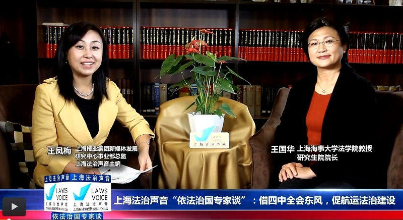 题记:为深入学习贯彻四中全会精神,迎接首个国家宪法日,上海法治声音和上海市法学会联合推出精心准备的7期“依法治国专家谈”专题节目。上海法治声音是由上海报业集团出品的全新法治类新媒体,在业内极具影响力。上海海事大学法学院教授、研究生院院长王国华应邀参加访谈,并对十八届四中全会精神进行了深入的解读,同时其还就加快中国航运法治建设进程提出了独到见解,并对我校航运法律人才模式和取得的成绩进行了介绍。