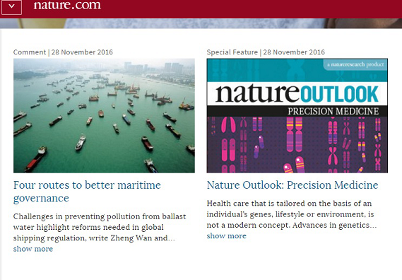 12月1日,英国《自然》杂志以专家评述形式刊发了题为《Four routes to better maritime governance》(中译:《全球海事公共治理的改革路径》)的航运公共政策文章。我校高原学科团队教师万征、陈继红、陈扬,荷兰阿姆斯特丹应用科学大学高级经济师Abdel El Makhloufi,美国科学院运输研究委员会 (TRB) 主席Dan Sperling 为本文共同作者。(原文:Nature 540, 27–29 doi:10.1038/ 540027a)