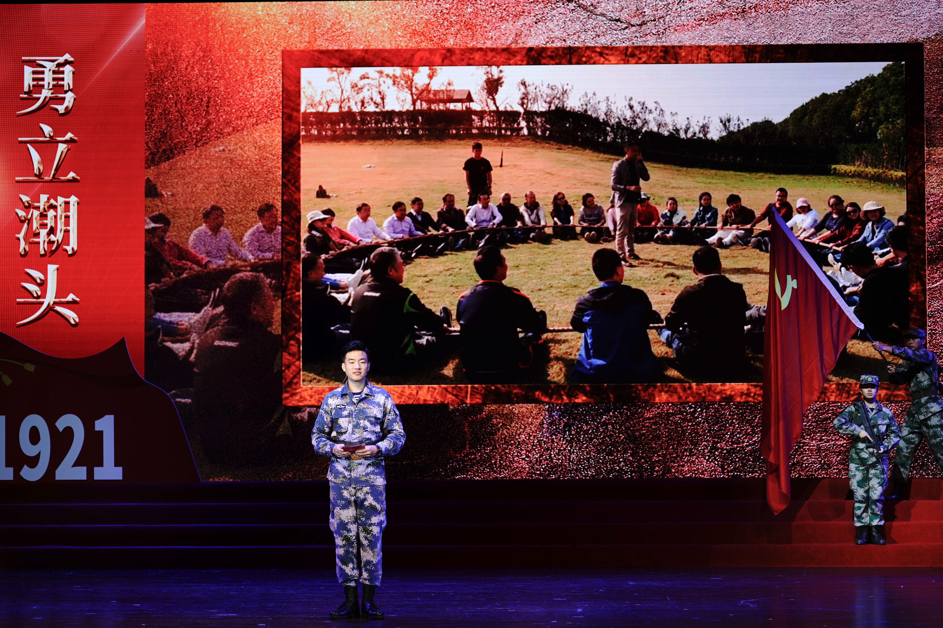 示范党课现场,远程连线了退休教师刘泽雨、校友代表詹春珮等。师生代表祝立钟、左飚、姚裕丰、安博文、王盈铭、石宇、于尧、康慧芳、夏克日扎提、相苹钰、高睿、赵轶澜、李柯男、田琪、夏米西努、胡窝康、穆斯塔帕江等参与现场演出。《把青春压进枪膛》的演讲人退伍大学生代表姚禹含,分享了他服役于海军南沙水警区永暑礁期间的故事;《民族团结之花在海大绽放》情景讲述了学校积极做好少数民族学生教育教学工作的故事。